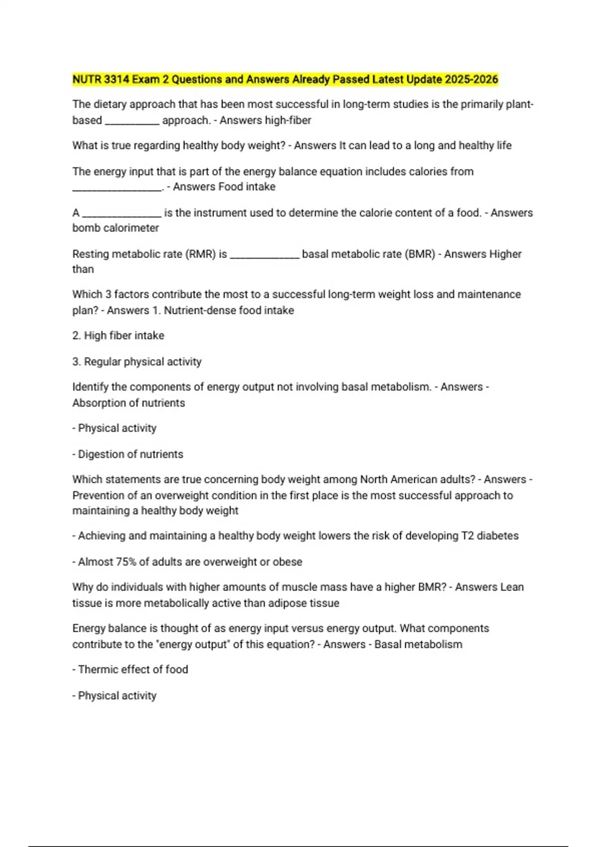 NUTR 3314 Exam 2 Questions and Answers Already Passed Latest Update The dietary approach that has been most successful in long-term studies is the primarily plant-based ___________ approach. - Answers high-fiber What is true regarding healthy body weight? - Answers It can lead to a long and healthy life The energy input that is part of the energy balance equation includes calories from __________________. - Answers Food intake A ________________ is the instrument used to determine the calorie content of a food. - Answers bomb calorimeter Resting metabolic rate (RMR) is ______________ basal metabolic rate (BMR) - Answers Higher than Which 3 factors contribute the most to a successful long-term weight loss and maintenance plan? - Answers 1. Nutrient-dense food intake 2. High fiber intake 3. Regular physical activity Identify the components of energy output not involving basal metabolism. - Answers - Absorption of nutrients - Physical activity - Digestion of nutrients Which statements are true concerning body weight among North American adults? - Answers - Prevention of an overweight condition in the first place is the most successful approach to maintaining a healthy body weight - Achieving and maintaining a healthy body weight lowers the risk of developing T2 diabetes - Almost 75% of adults are overweight or obese Why do individuals with higher amounts of muscle mass have a higher BMR? - Answers Lean tissue is more metabolically active than adipose tissue Energy balance is thought of as energy input versus energy output. What components contribute to the "energy output" of this equation? - Answers - Basal metabolism - Thermic effect of food - Physical activity The bomb calorimeter works by ________________. - Answers measuring the heat given off by a food as it is burned During physical activity, a lot of energy is lost as _________________. - Answers heat Which activities are part of a measurement of basal metabolism? - Answers - Beating of the heart - Respiration - The work of the liver, kidneys, and brain If Craig desires to increase his basal metabolic rate (BMR), he can modify his - Answers Lean body mass The energy used for the digestion, absorption, and processing of food is called the ______________ - Answers Thermic effect of food Which technique could be used to determine the amount of calories a person expends each day? - Answers - Indirect calorimetry - Direct calorimetry
