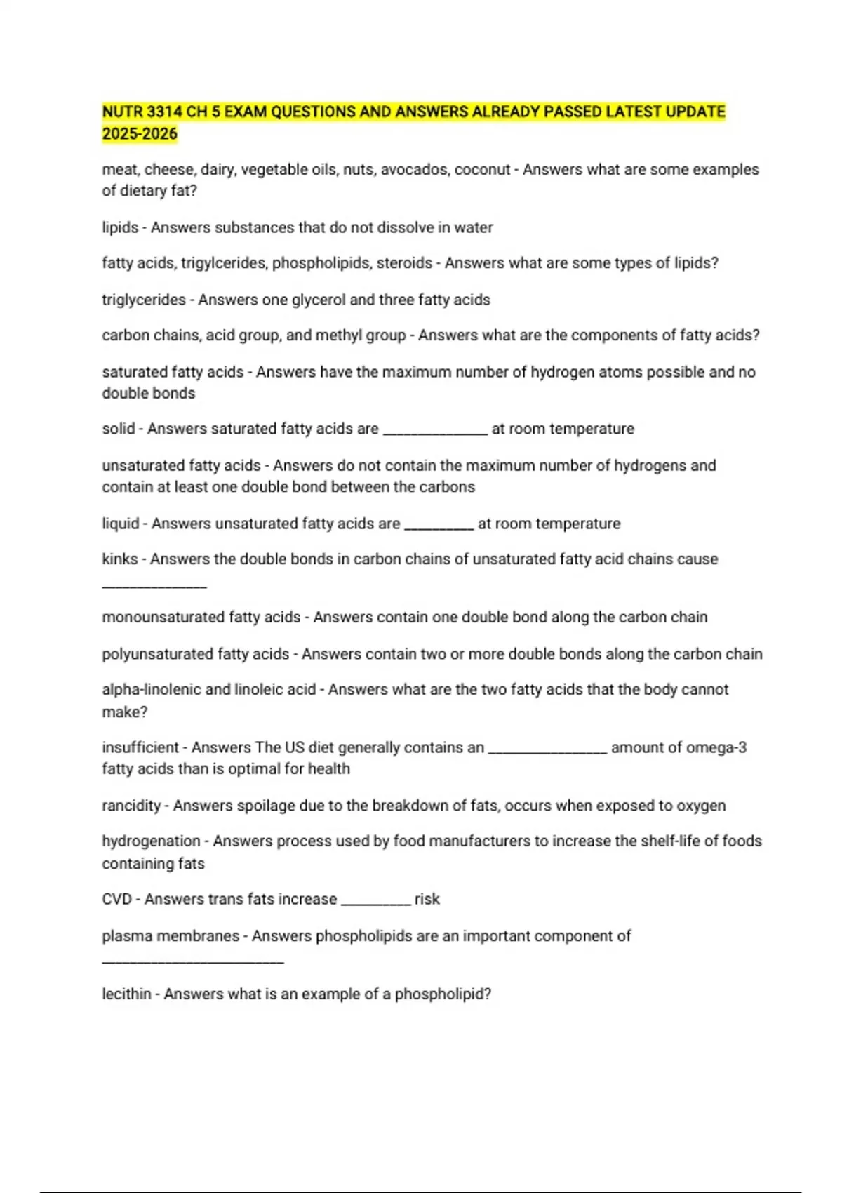 NUTR 3314 CH 5 EXAM QUESTIONS AND ANSWERS ALREADY PASSED LATEST UPDATE meat, cheese, dairy, vegetable oils, nuts, avocados, coconut - Answers what are some examples of dietary fat? lipids - Answers substances that do not dissolve in water fatty acids, trigylcerides, phospholipids, steroids - Answers what are some types of lipids? triglycerides - Answers one glycerol and three fatty acids carbon chains, acid group, and methyl group - Answers what are the components of fatty acids? saturated fatty acids - Answers have the maximum number of hydrogen atoms possible and no double bonds solid - Answers saturated fatty acids are _______________ at room temperature unsaturated fatty acids - Answers do not contain the maximum number of hydrogens and contain at least one double bond between the carbons liquid - Answers unsaturated fatty acids are __________ at room temperature kinks - Answers the double bonds in carbon chains of unsaturated fatty acid chains cause _______________ monounsaturated fatty acids - Answers contain one double bond along the carbon chain polyunsaturated fatty acids - Answers contain two or more double bonds along the carbon chain alpha-linolenic and linoleic acid - Answers what are the two fatty acids that the body cannot make? insufficient - Answers The US diet generally contains an _________________ amount of omega-3 fatty acids than is optimal for health rancidity - Answers spoilage due to the breakdown of fats, occurs when exposed to oxygen hydrogenation - Answers process used by food manufacturers to increase the shelf-life of foods containing fats CVD - Answers trans fats increase __________ risk plasma membranes - Answers phospholipids are an important component of __________________________