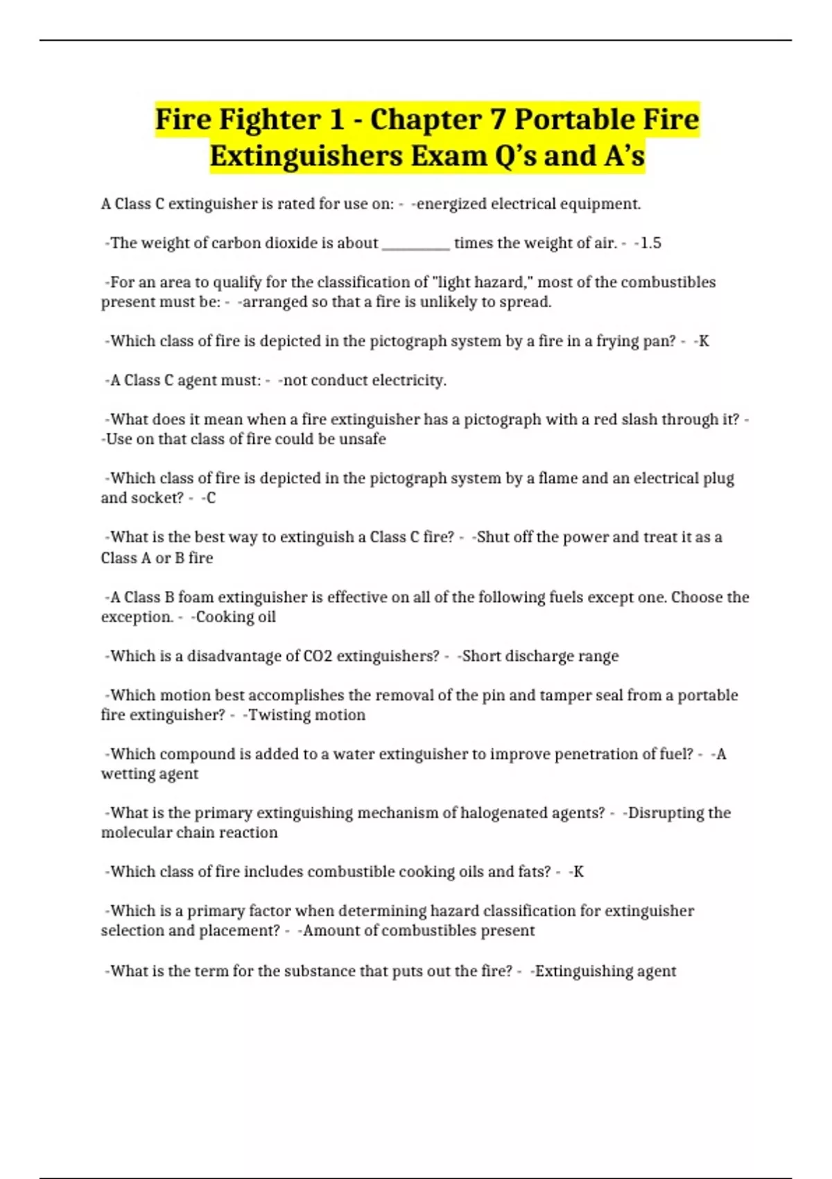 Fire Fighter 1 - Chapter 7 Portable Fire Extinguishers Exam Q’s and A’s