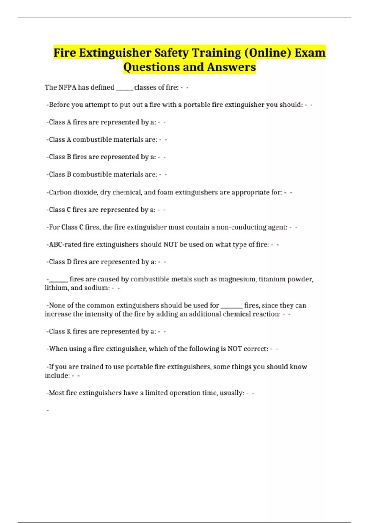 Fire Extinguisher Safety Training (Online) Exam Questions and Answers