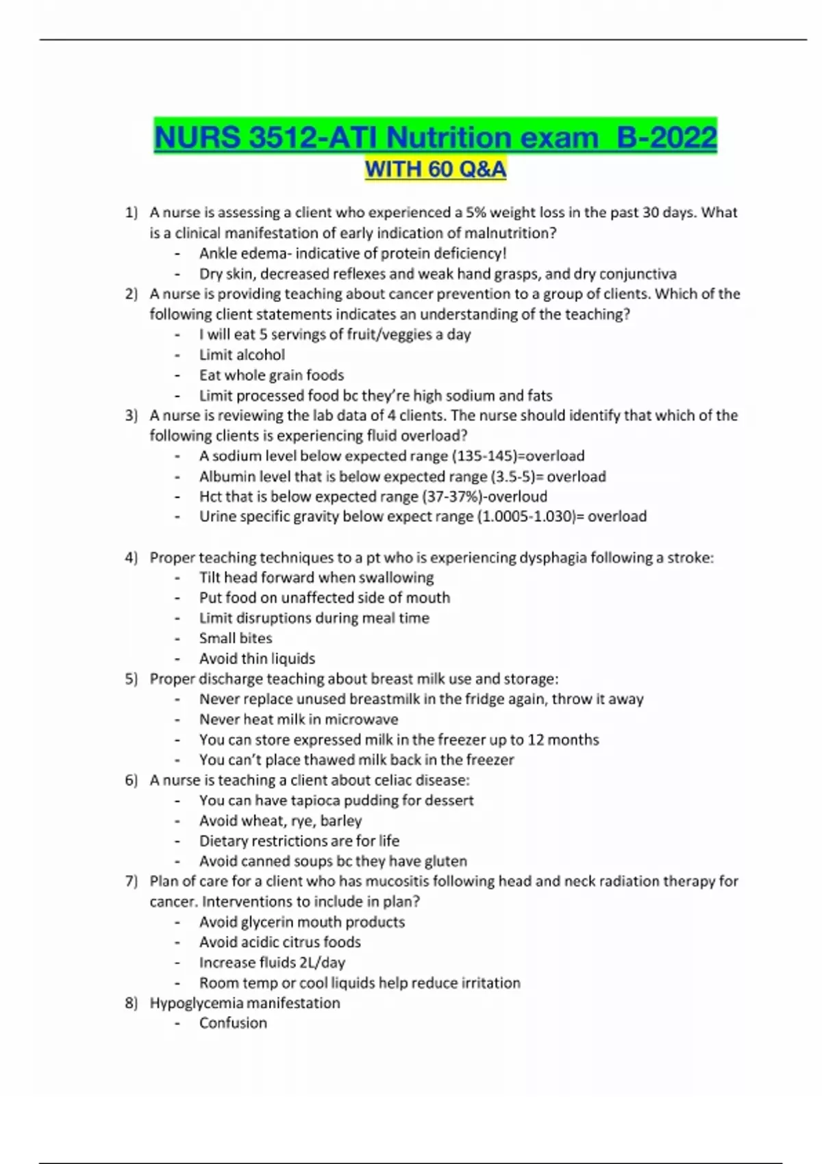 NURS 3512: ATI Nutrition Practice Exam B 2022. QUESTIONS AND ANSWERS. LATEST UPDATED VERSION 1) A nurse is assessing a client who experienced a 5% weight loss in the past 30 days. What is a clinical manifestation of early indication of malnutrition? - - Ankle edema- indicative of protein deficiency! Dry skin, decreased reflexes and weak hand grasps, and dry conjunctiva 2) A nurse is providing teaching about cancer prevention to a group of clients. Which of the following client statements indicates an understanding of the teaching? - - - - I will eat 5 servings of fruit/veggies a day Limit alcohol Eat whole grain foods Limit processed food bc they’re high sodium and fats 3) A nurse is reviewing the lab data of 4 clients. The nurse should identify that which of the following clients is experiencing fluid overload? - - - - A sodium level below expected range (135-145)=overload Albumin level that is below expected range (3.5-5)= overload Hct that is below expected range (37-37%)-overloud Urine specific gravity below expect range (1.0005-1.030)= overload 4) Proper teaching techniques to a pt who is experiencing dysphagia following a stroke: - - - - - Tilt head forward when swallowing Put food on unaffected side of mouth Limit disruptions during meal time Small bites Avoid thin liquids 5) Proper discharge teaching about breast milk use and storage: - - - - Never replace unused breastmilk in the fridge again, throw it away Never heat milk in microwave You can store expressed milk in the freezer up to 12 months You can’t place thawed milk back in the freezer 6) A nurse is teaching a client about celiac disease: - - - - You can have tapioca pudding for dessert Avoid wheat, rye, barley Dietary restrictions are for life Avoid canned soups bc they have gluten 7) Plan of care for a client who has mucositis following head and neck radiation therapy for cancer. Interventions to include in plan? - - - - Avoid glycerin mouth products Avoid acidic citrus foods Increase fluids 2L/day Room temp or cool liquids help reduce irritation