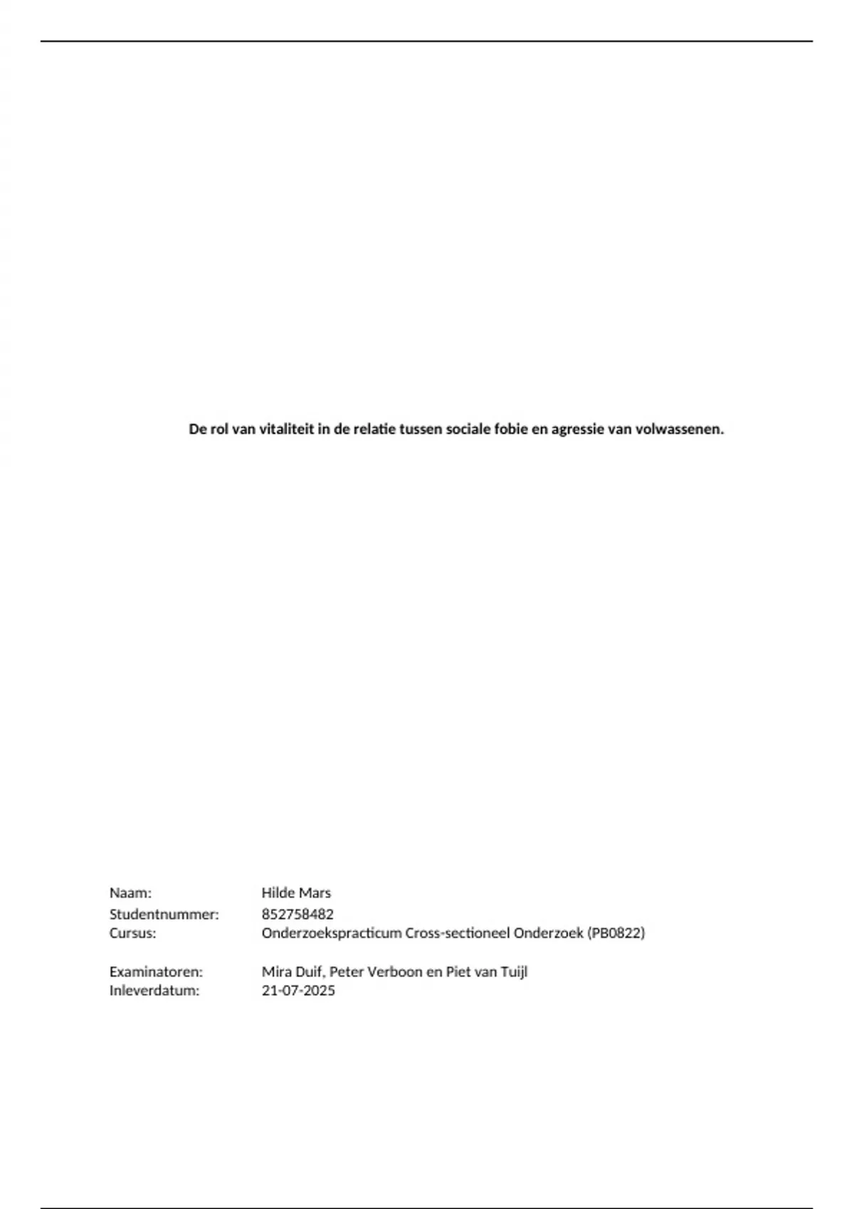 De rol van vitaliteit in de relatie tussen sociale fobie en agressie van volwassenen.