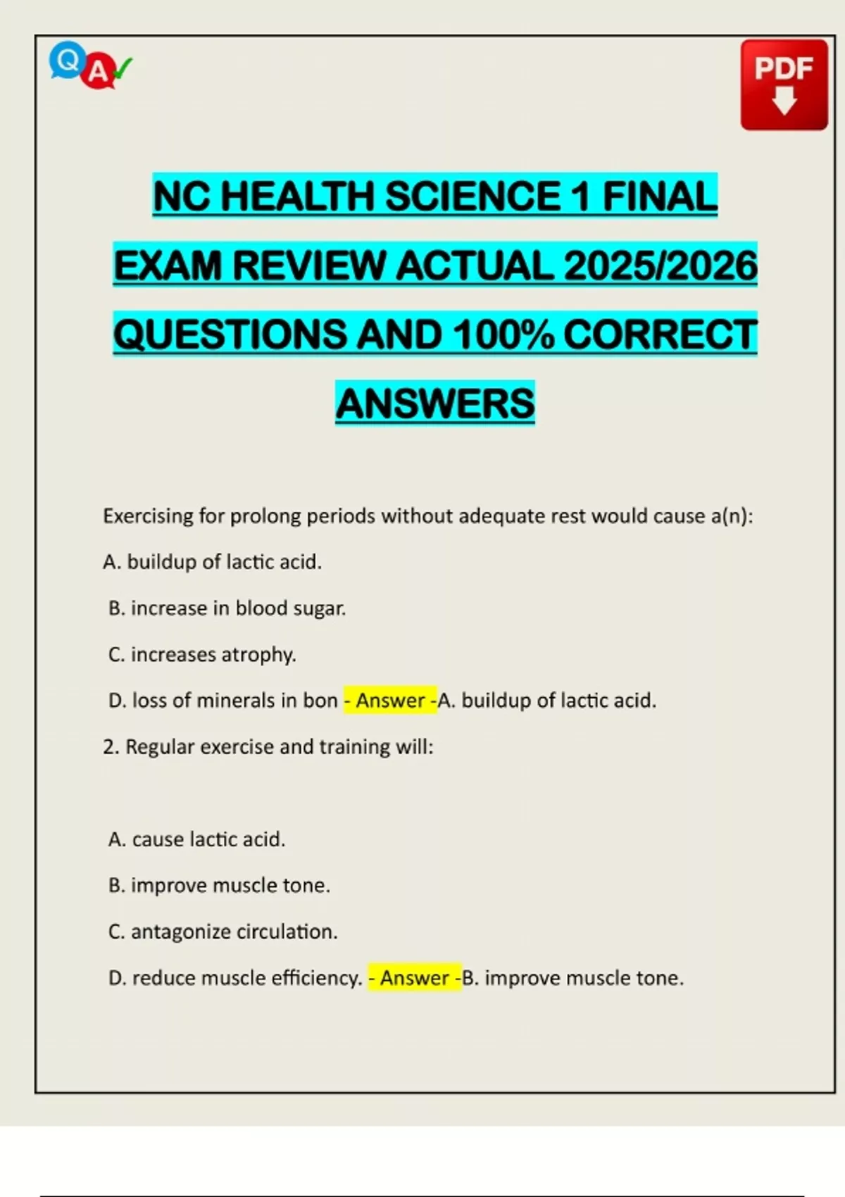 NC HEALTH SCIENCE 1 FINAL EXAM REVIEW ACTUAL 2025/2026 QUESTIONS AND 100% CORRECT ANSWERS Exercising for prolong periods without adequate rest would cause a(n): A. buildup of lactic acid. B. increase in blood sugar. C. increases atrophy. D. loss of minerals in bon - Answer -A. buildup of lactic acid. 2. Regular exercise and training will: A. cause lactic acid. B. improve muscle tone. C. antagonize circulation. D. reduce muscle efficiency. - Answer -B. improve muscle tone.Need assistance in Online classes, Exams & Assignments? Reach out for Full Course Assistance, Plagiarism-free Essay Writing, Research Paper & Discussion Posts. Confidential & Secure! Email now at: 3. Joe lifts weights daily. He has a bulging through a weak abdominal muscle. What is his diagnosis? NCCTE.9_12.HS.HU40.01 RBT: A. Fibromyalgia B. Hernia C. Muscular Dystrophy D. Tendonitis - Answer -B. Hernia 4. When Joe flexes his bicep, what characteristic of muscles describes what is happening to his bicep? NCCTE.9_12.HS.HU40.01 RBT: A. Contractibility