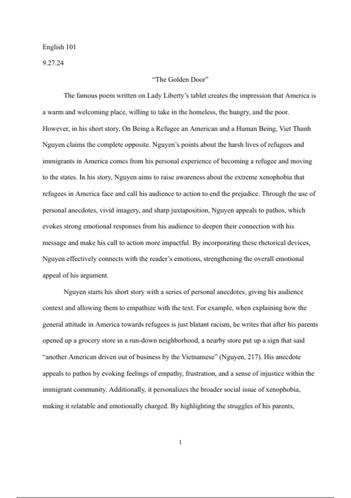"The famous poem written on Lady Liberty’s tablet creates the impression that America is a warm and welcoming place, willing to take in the homeless, the hungry, and the poor. However, in his short story, On Being a Refugee an American and a Human Being, Viet Thanh Nguyen claims the complete opposite. Nguyen’s points about the harsh lives of refugees and immigrants in America comes from his personal experience of becoming a refugee and moving to the states..." This document is a 3-page rhetorical analysis of a persuasive text that explores the impact and effect of one rhetorical appeal through the lens of 1-3 rhetorical strategies/devices. Written without AI.