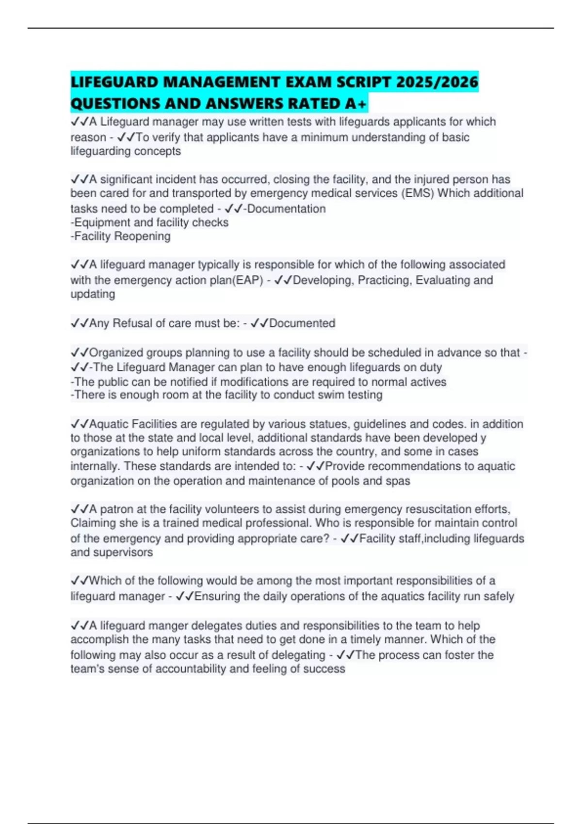 LIFEGUARD MANAGEMENT EXAM SCRIPT 2025/2026 QUESTIONS AND ANSWERS RATED A+