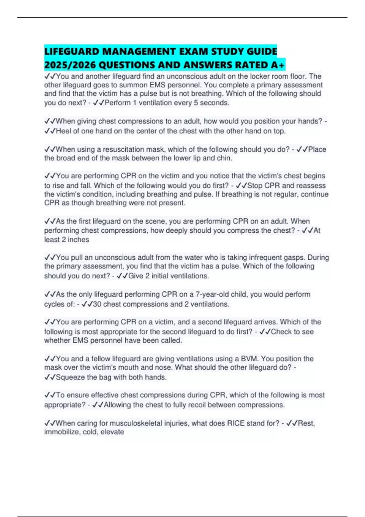 ✔✔You and another lifeguard are preparing for CPR on an adult who collapsed in the