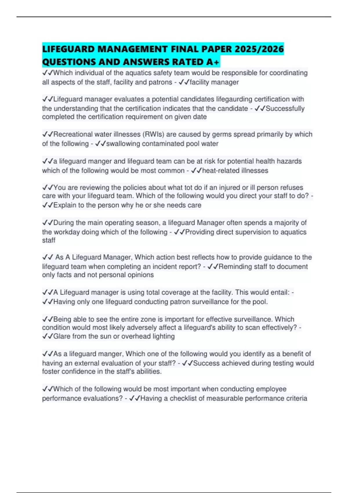 LIFEGUARD MANAGEMENT FINAL PAPER 2025/2026 QUESTIONS AND ANSWERS RATED A+