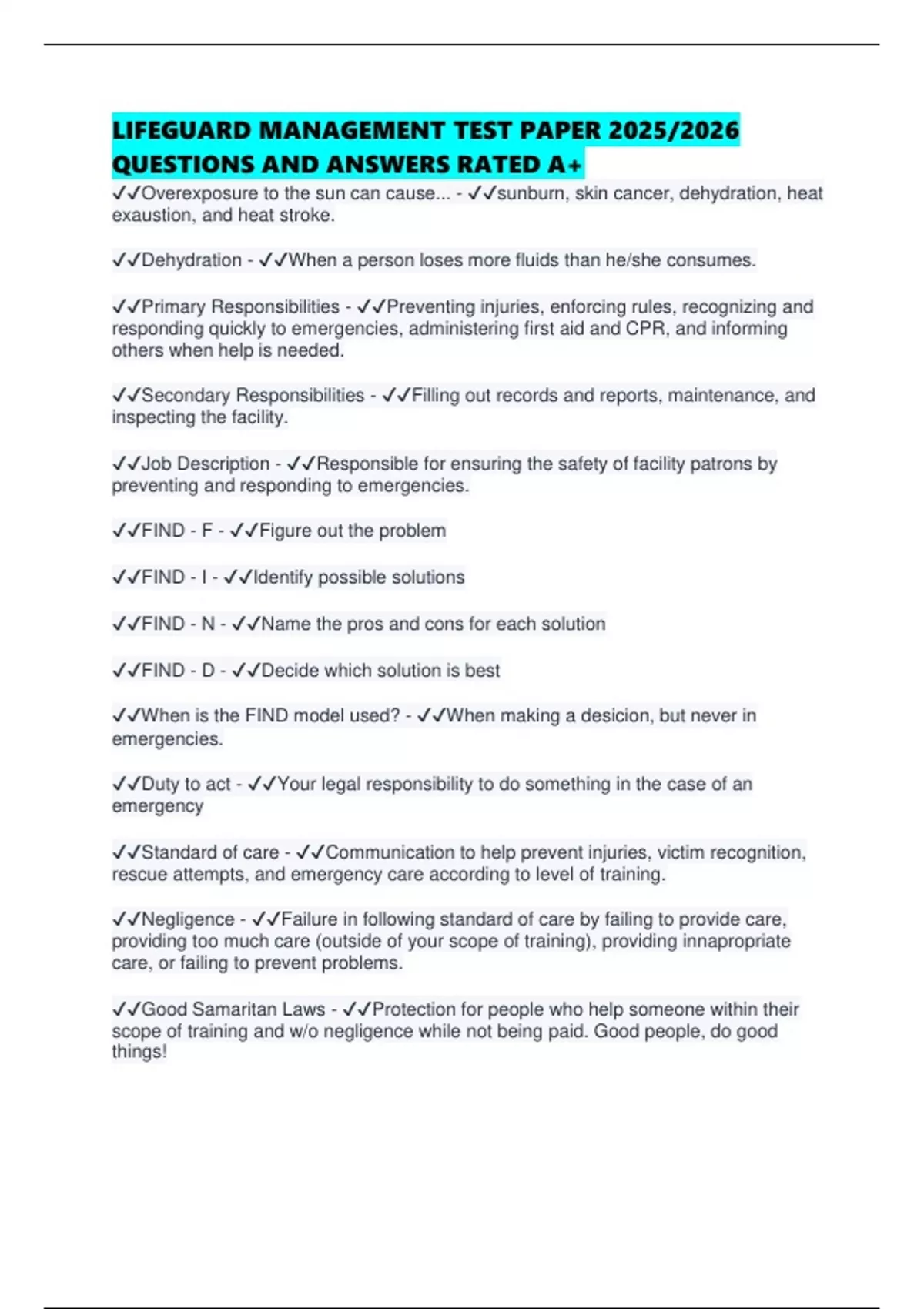 LIFEGUARD MANAGEMENT TEST PAPER 2025/2026 QUESTIONS AND ANSWERS RATED A+