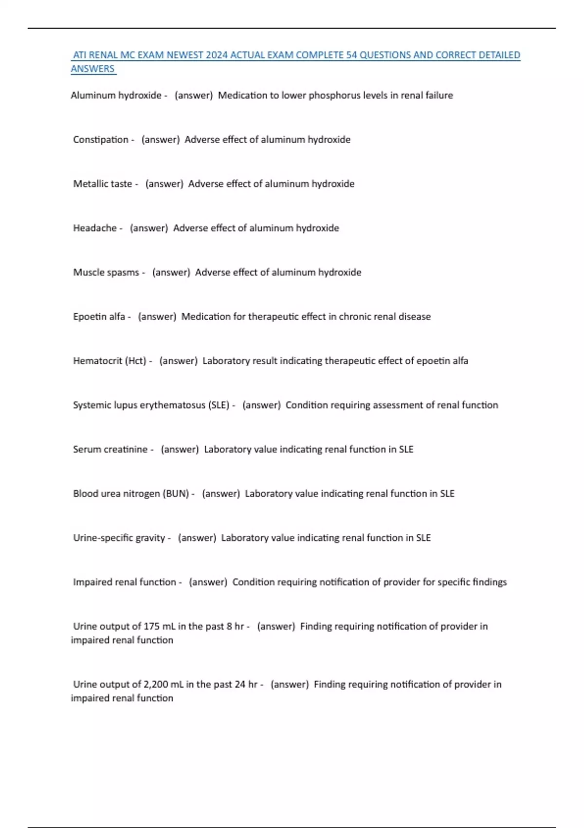 , ATI RENAL MC EXAM NEWEST 2024 ACTUAL EXAM COMPLETE 54 QUESTIONS AND CORRECT DETAILED