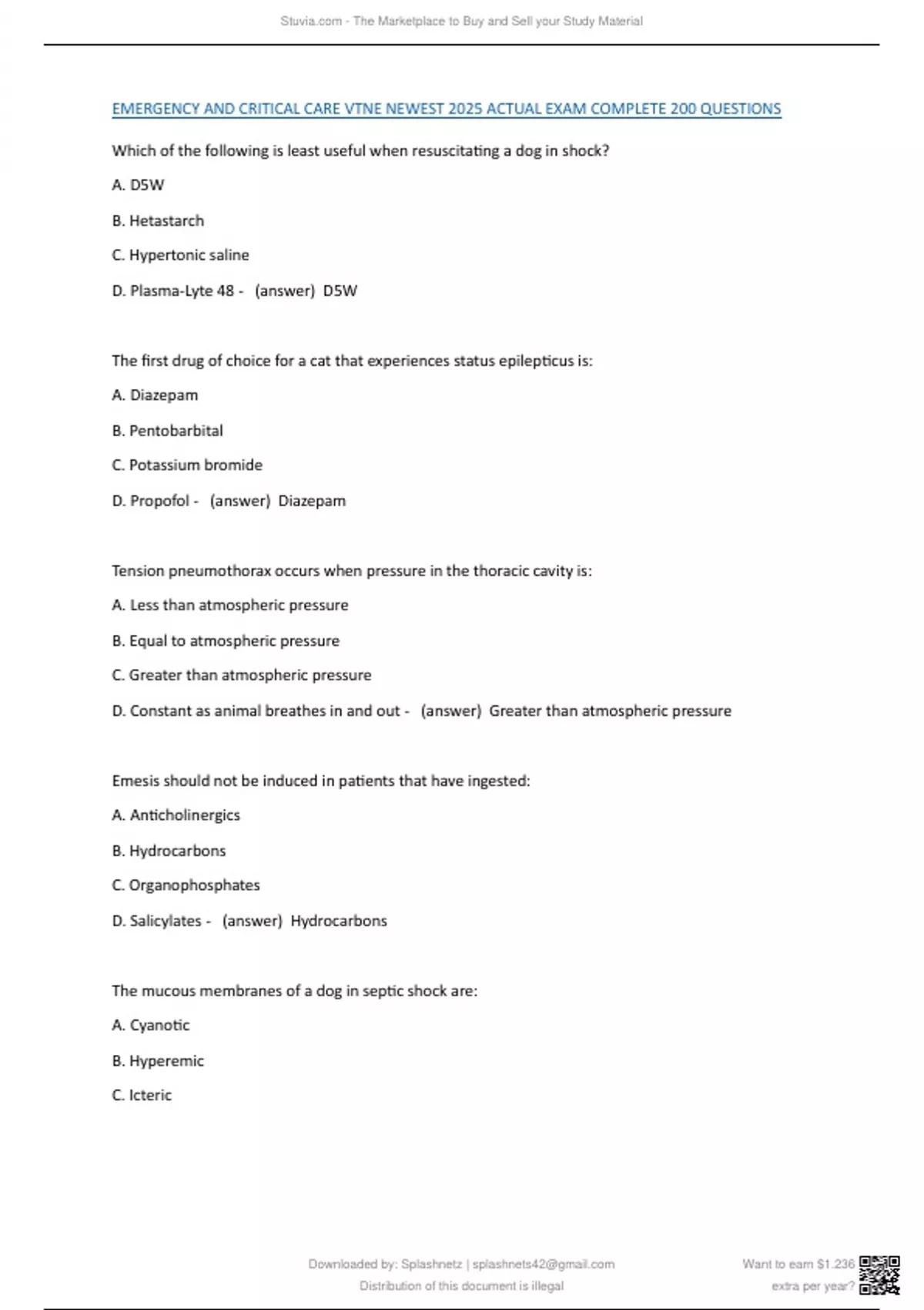 EMERGENCY AND CRITICAL CARE VTNE NEWEST 2025 ACTUAL EXAM COMPLETE 200 QUESTIONS