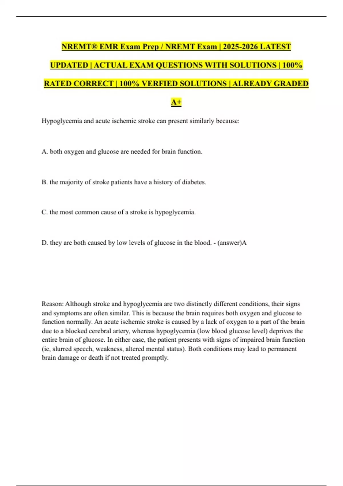 Reason: Although stroke and hypoglycemia are two distinctly different conditions, their signs