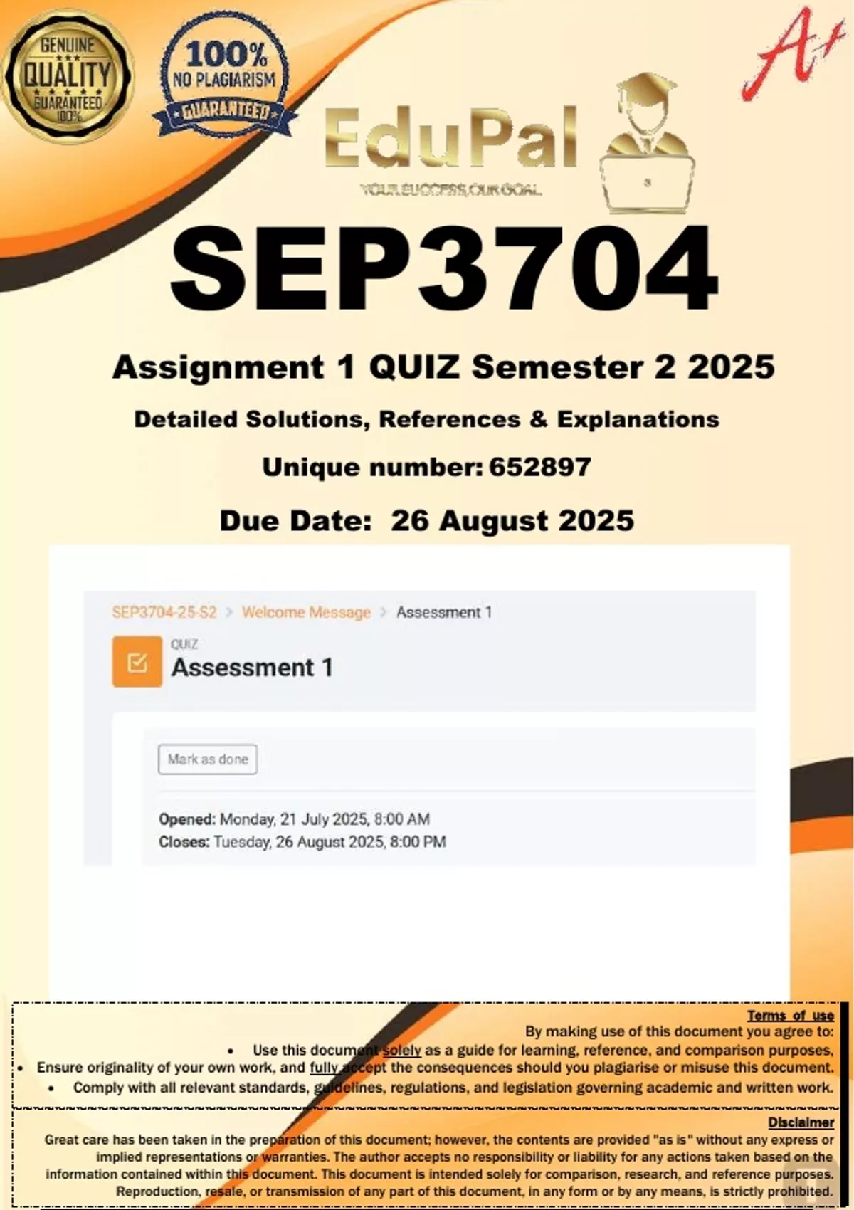 SEP3707 Assignment 1 QUIZ (COMPLETE ANSWERS) Semester 1 2025 (652897)- DUE 26 August 2025; 100% TRUSTED Complete, trusted solutions and explanations. For assistance, Whats-App 0.6.7-1.7.1-1.7.3.9. Ensure your success with us. .