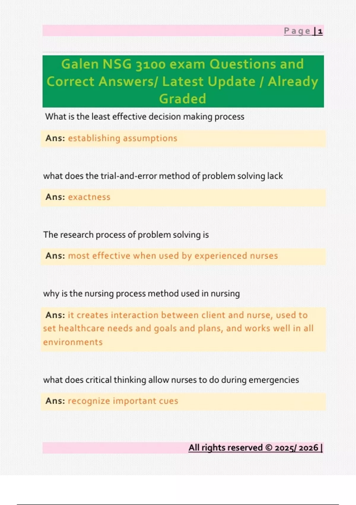 Galen NSG 3100 exam Questions and