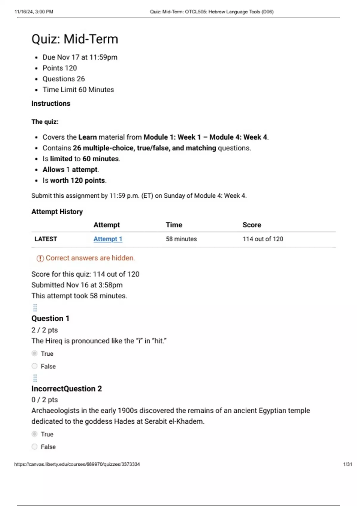 https://canvas.liberty.edu/courses/689970/quizzes/3373334 1/31