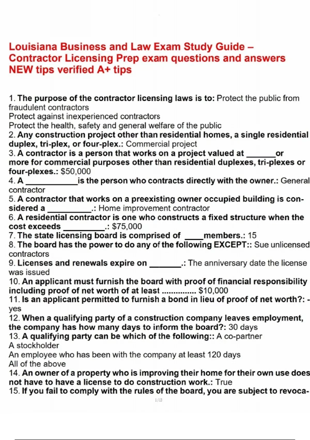 Louisiana Business and Law Exam Study Guide – Contractor Licensing Prep exam questions and answers NEW tips verified A+ Louisiana Business and Law Exam Study Guide – Contractor Licensing Prep exam questions and answers NEW tips verified A+ Louisiana Business and Law Exam Study Guide – Contractor Licensing Prep exam questions and answers NEW tips verified A+