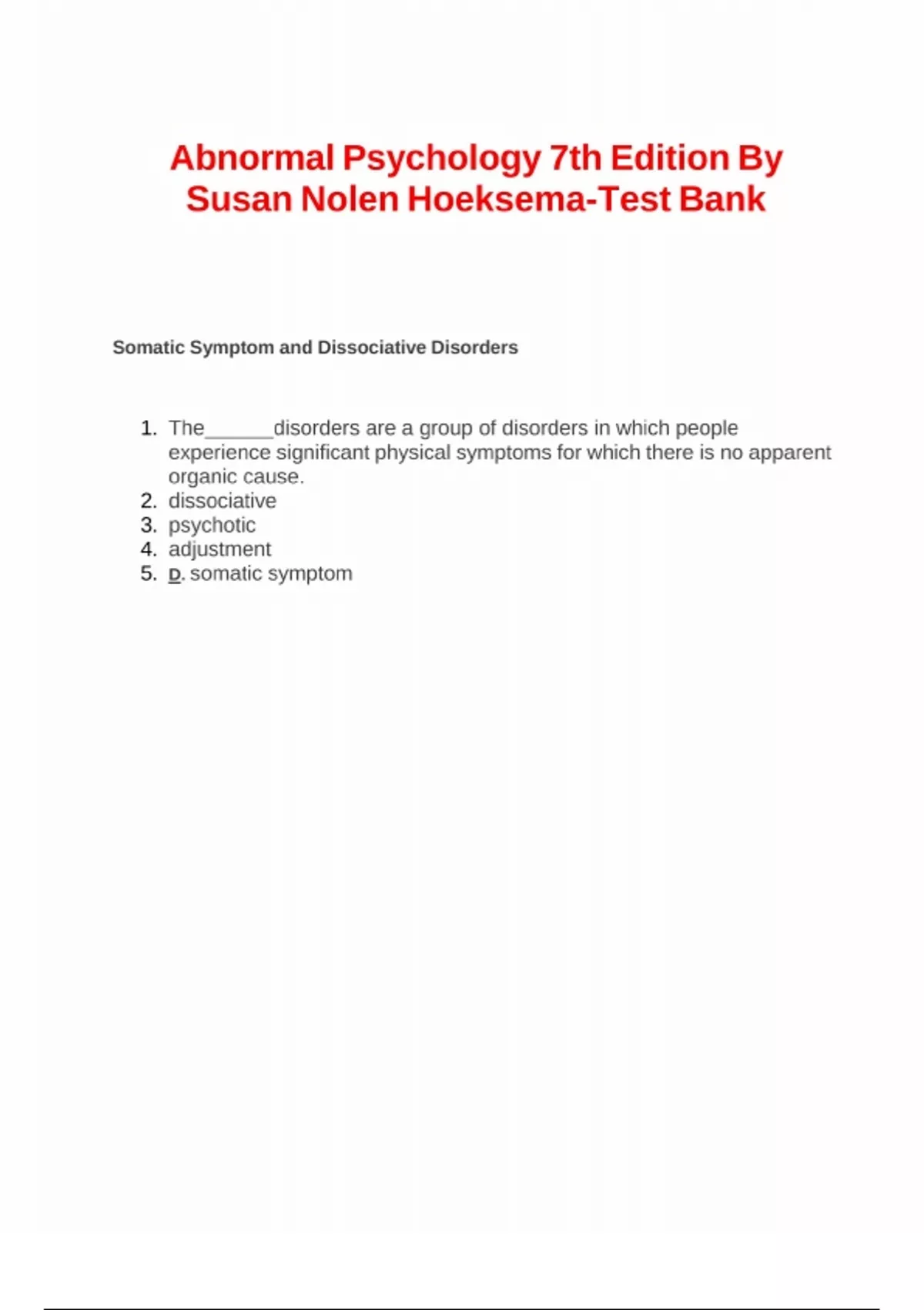Test Bank FOR Abnormal Psychology 7th Edition By Susan Nolen Hoeksema