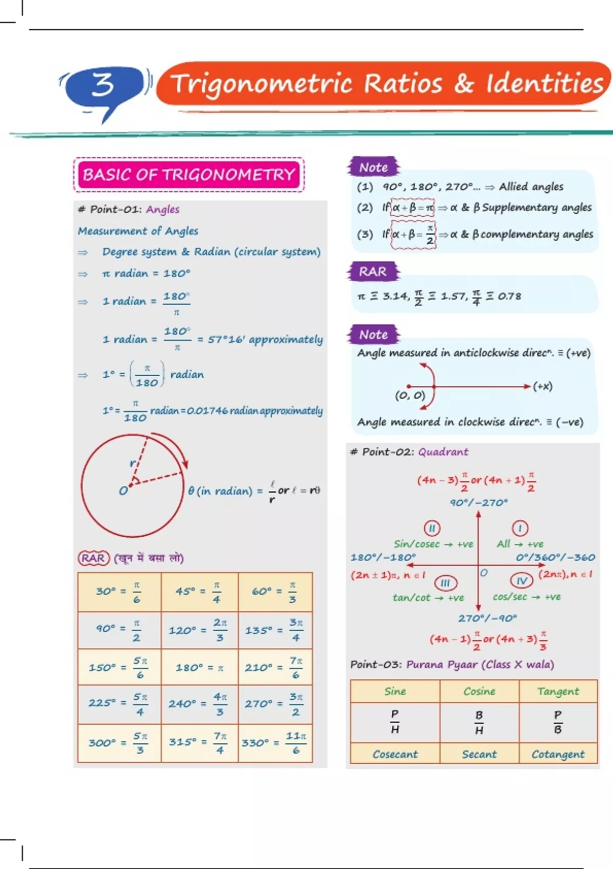 ⇒ π radian = 180° RAR