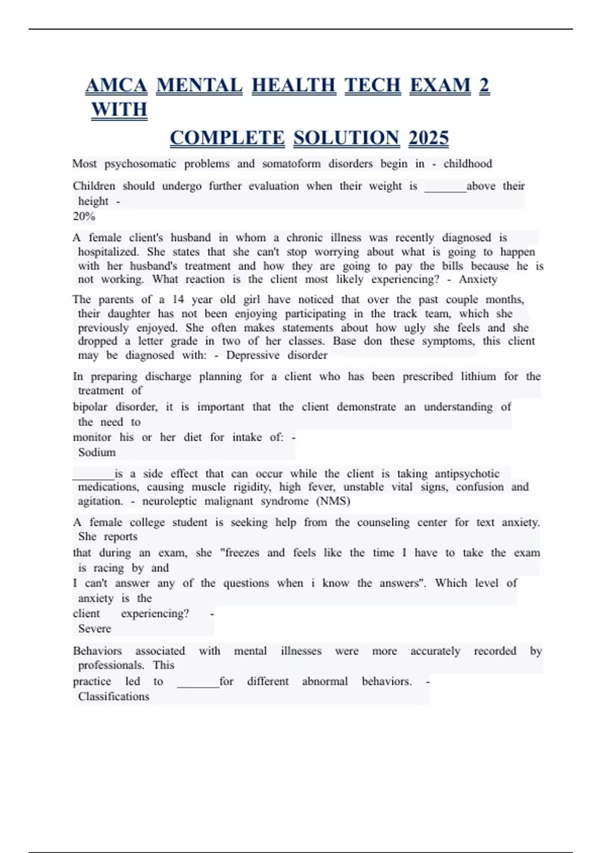AMCA MENTAL HEALTH TECH EXAM 2 WITH COMPLETE SOLUTION 2025 AMCA MENTAL HEALTH TECH EXAM 2 WITH COMPLETE SOLUTION 2025 AMCA MENTAL HEALTH TECH EXAM 2 WITH COMPLETE SOLUTION 2025 AMCA MENTAL HEALTH TECH EXAM 2 WITH COMPLETE SOLUTION 2025 AMCA MENTAL HEALTH TECH EXAM 2 WITH COMPLETE SOLUTION 2025