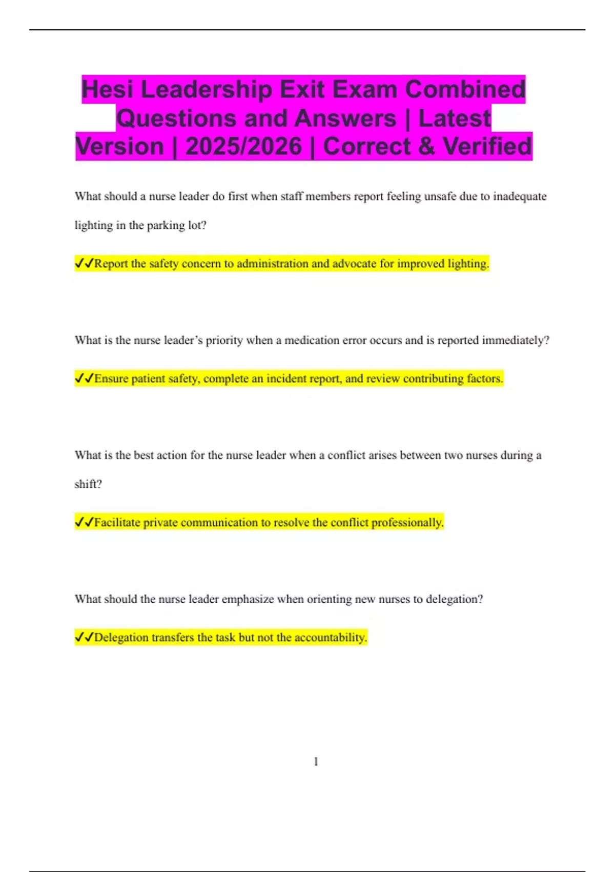 Hesi Leadership Exit Exam Combined Questions and Answers | Latest Version | 2025/2026 | Correct & Verified What should a nurse leader do first when staff members report feeling unsafe due to inadequate lighting in the parking lot? Report the safety concern to administration and advocate for improved lighting. What is the nurse leader’s priority when a medication error occurs and is reported immediately? Ensure patient safety, complete an incident report, and review contributing factors. What is the best action for the nurse leader when a conflict arises between two nurses during a shift? Facilitate private communication to resolve the conflict professionally. What should the nurse leader emphasize when orienting new nurses to delegation? Delegation transfers the task but not the accountability. 2 What is the most effective way for a nurse leader to encourage staff to adopt evidence-based practice? Provide access to resources and create opportunities for staff education. What should the nurse leader do when a staff nurse refuses to perform a task within their scope? Clarify expectations and provide support or training if needed. What is the most important responsibility of the nurse leader in disaster planning? Ensure staff are aware of roles and responsibilities in the disaster plan. What should the nurse leader do when staff frequently complain about unfair assignments? Review and adjust assignments based on patient acuity and staff competency. What is the best leadership action when patient satisfaction scores are declining? Gather feedback from patients and staff, then implement improvement strategies. What should the nurse leader do when a staff member consistently arrives late? Address the issue privately and set clear expectations for punctuality. 3 What is the best response when a nurse expresses moral distress about caring for a dying patient? Provide emotional support and refer to counseling or debriefing services. What should the nurse leader do when a UAP is performing a task outside their role? Stop the task immediately and provide education on scope of practice. What is the nurse leader’s first step when investigating