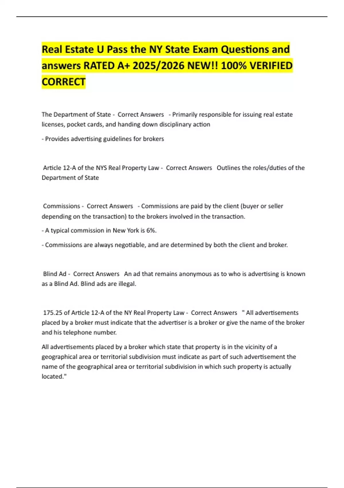 Ar cle 12-A of the NYS Real Property Law - Correct Answers Outlines the roles/du es of the