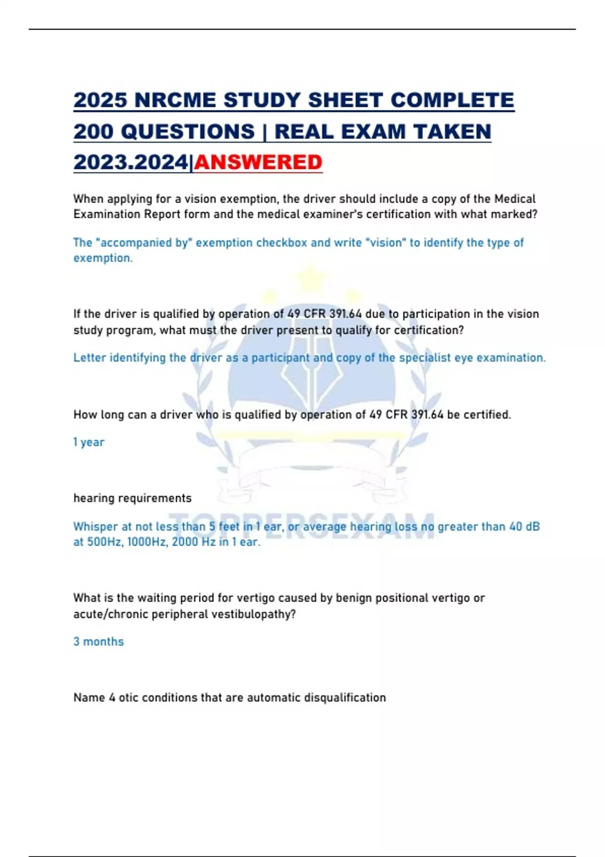 2025 NRCME STUDY SHEET COMPLETE 200 QUESTIONS | REAL EXAM TAKEN 2023.2024|ANSWERED