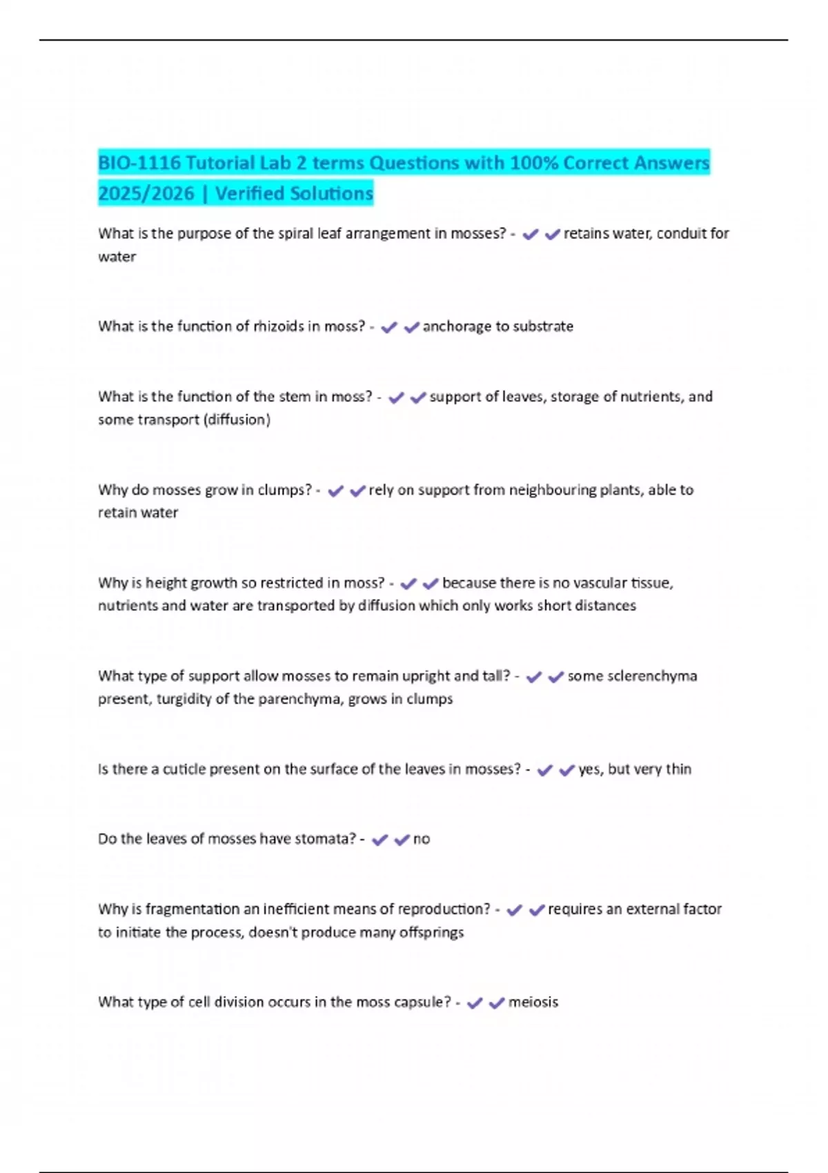 BIO-1116 Tutorial Lab 2 terms Questions with 100% Correct Answers 2025/2026 | Verified Solutions
