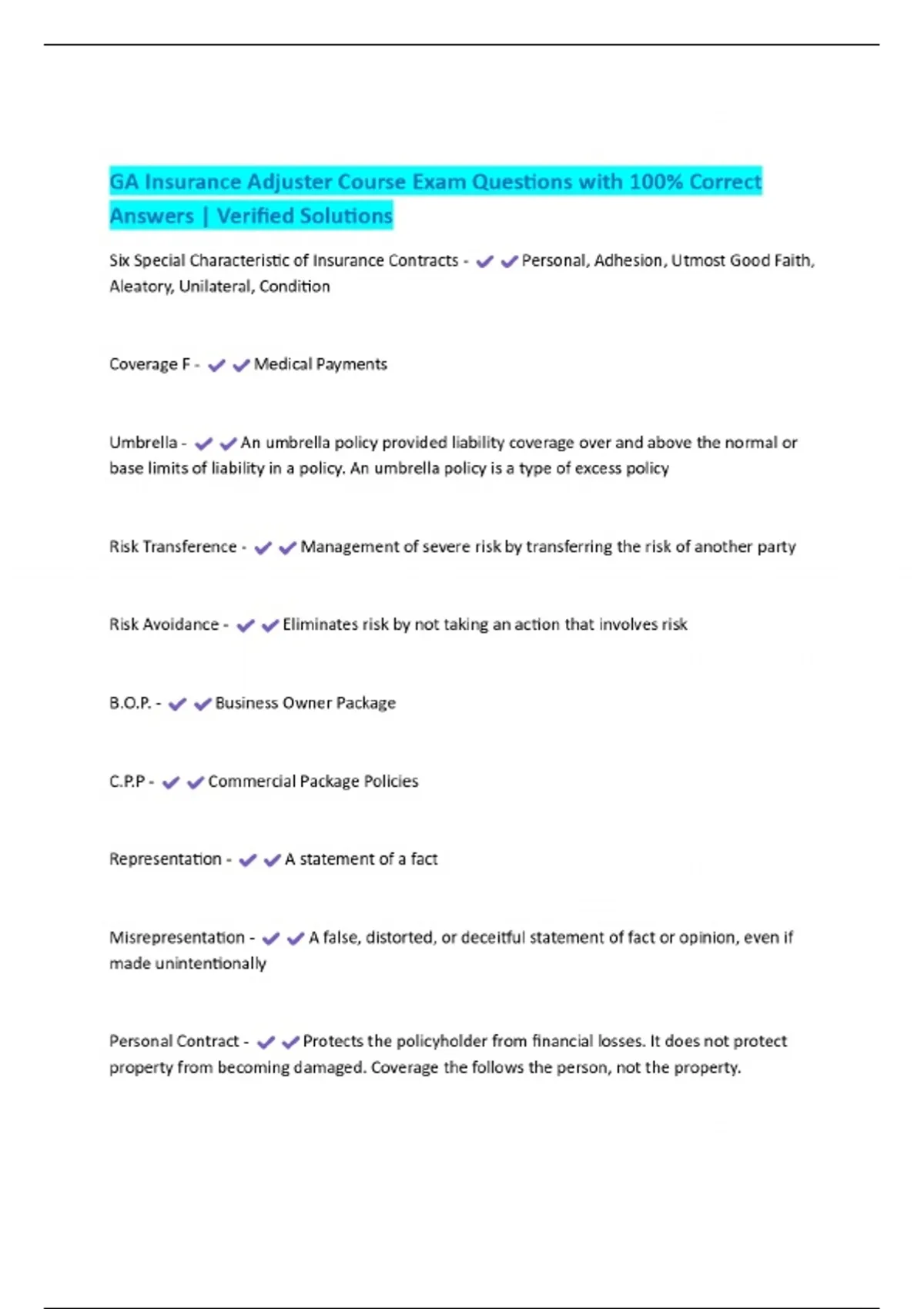 GA Insurance Adjuster Course Exam Questions with 100% Correct Answers | Verified Solutions