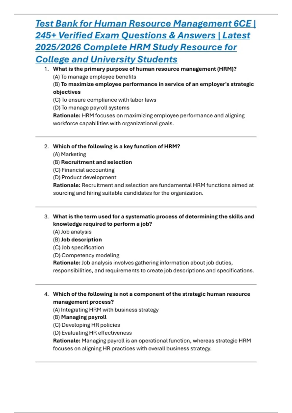 This Test Bank for Human Resource Management 6CE provides over 240 verified exam questions with detailed answers, covering all key topics including recruitment, selection, training and development, performance management, compensation, labor relations, employment law, and strategic HR practices. Designed to help college and university students prepare for exams, this 2025/2026 updated resource is an essential study tool for mastering HRM concepts, improving test performance, and achieving academic success in Human Resource Management courses.