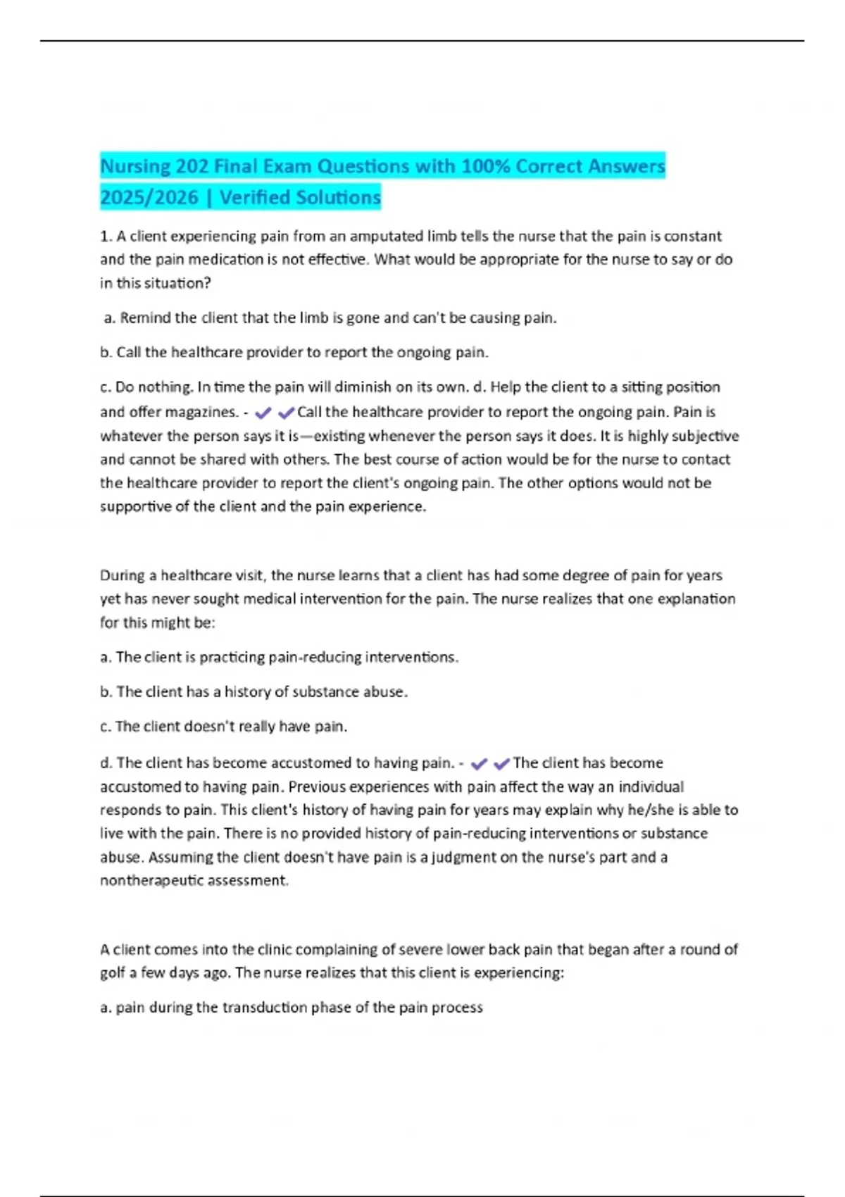 Nursing 202 Final Exam Questions with 100% Correct Answers 2025/2026 | Verified Solutions