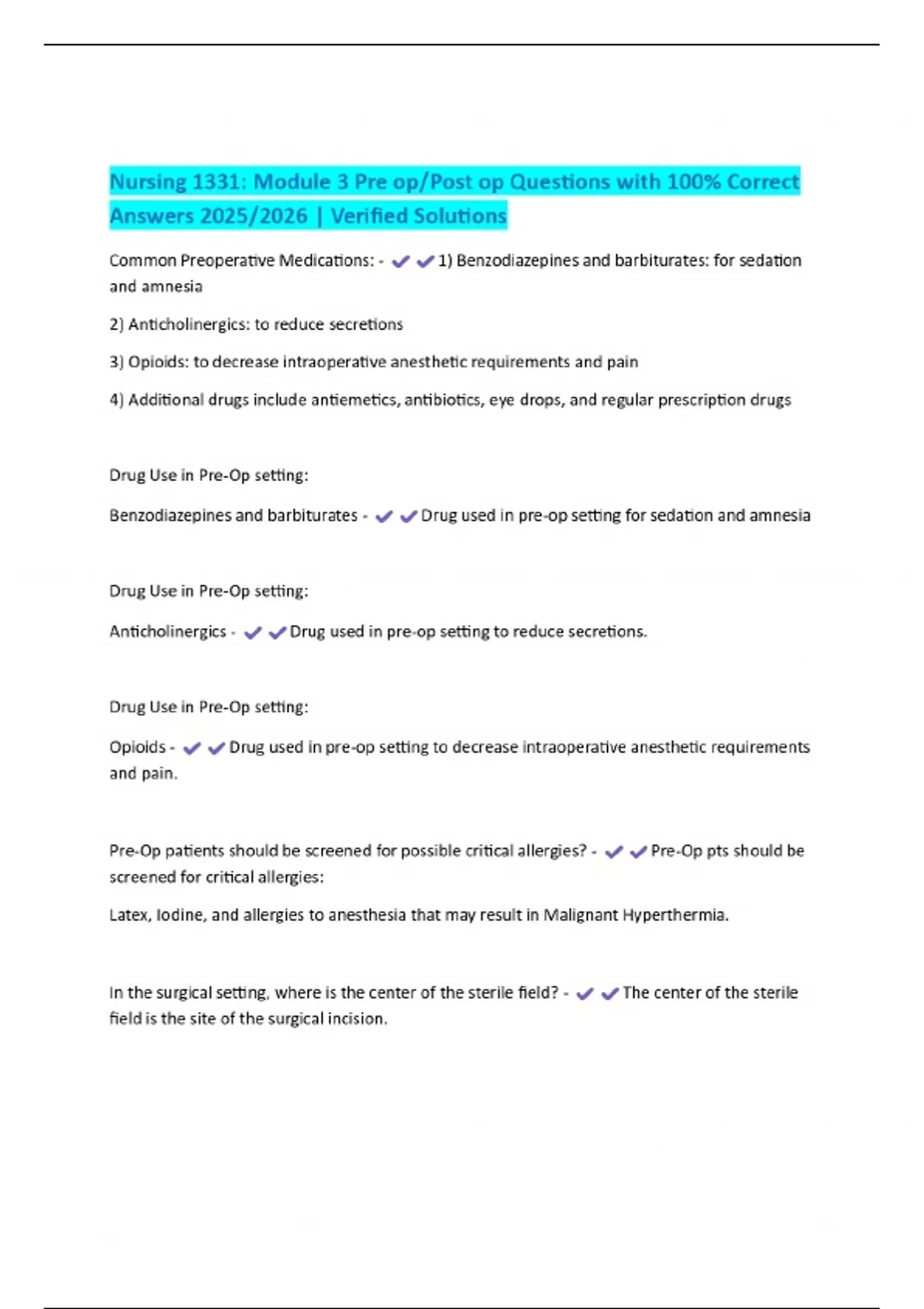 Nursing 1331: Module 3 Pre op/Post op Questions with 100% Correct Answers 2025/2026 | Verified Solutions