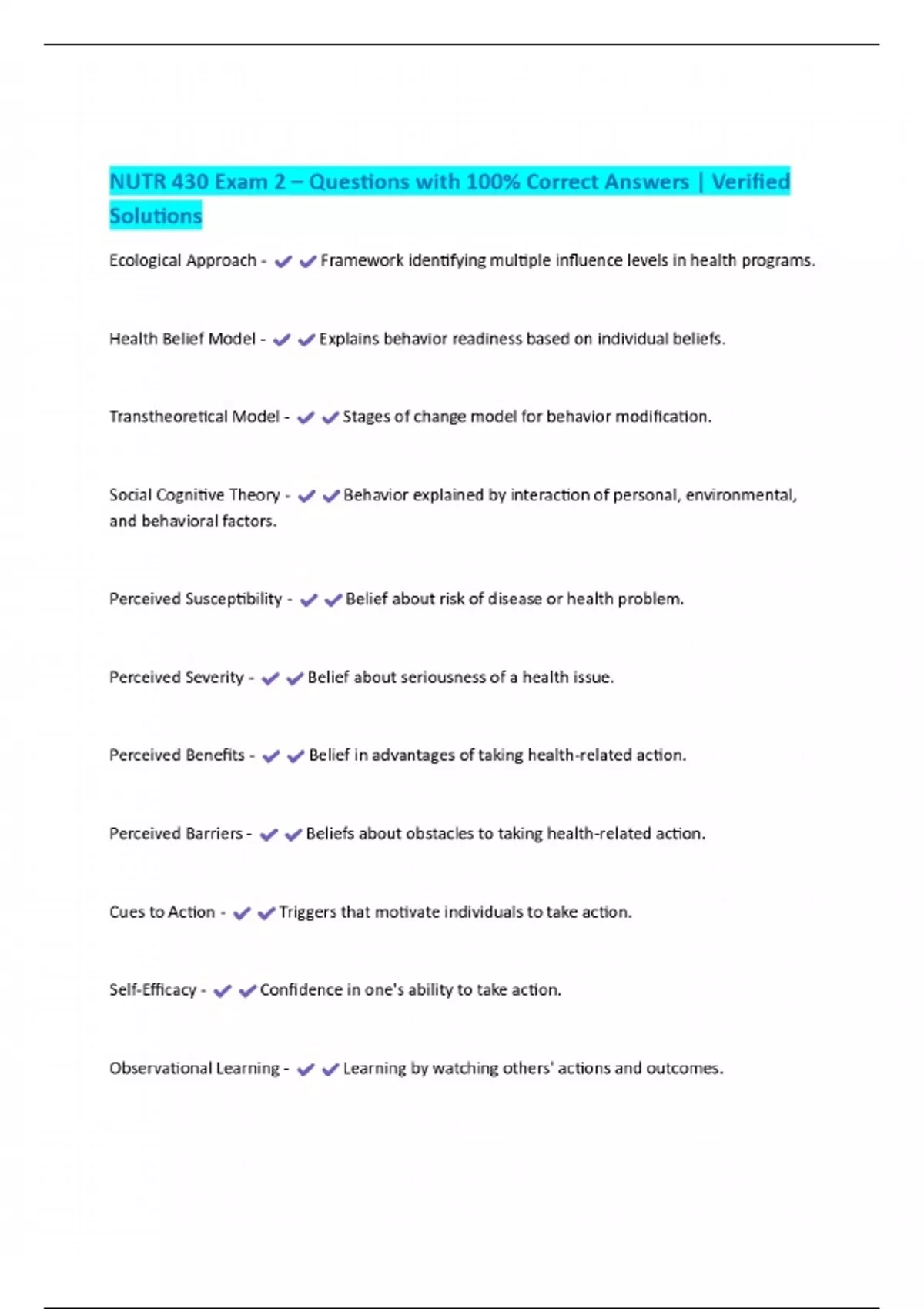NUTR 430 Exam 2 – Questions with 100% Correct Answers | Verified Solutions