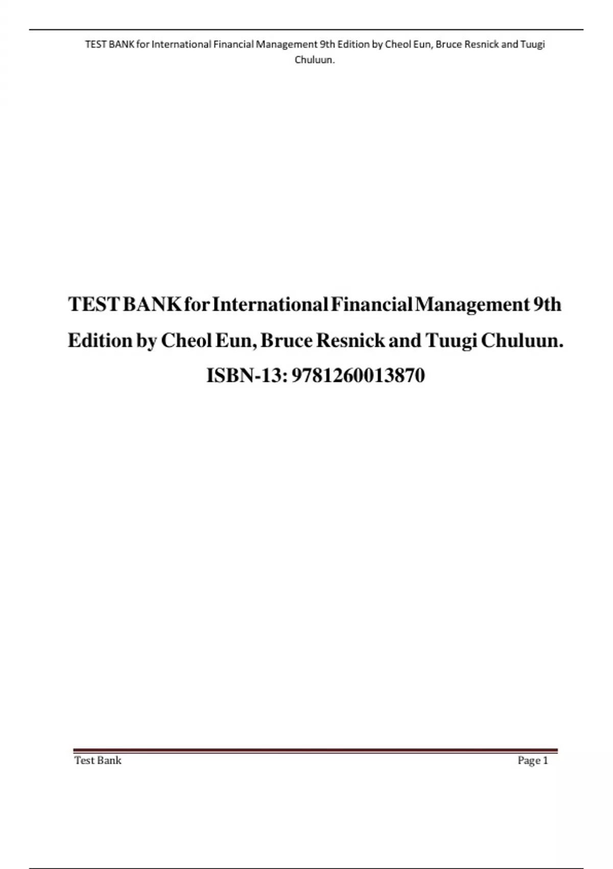 A comprehensive test bank for the 9th edition of International Financial Management by Cheol Eun, Bruce Resnick, and Tuugi Chuluun. Includes multiple-choice questions and answers covering key topics such as foreign exchange risk, political risk, market imperfections, comparative advantage, multinational corporations, and international financial markets. Ideal for instructors and students seeking practice and assessment tools in international finance.