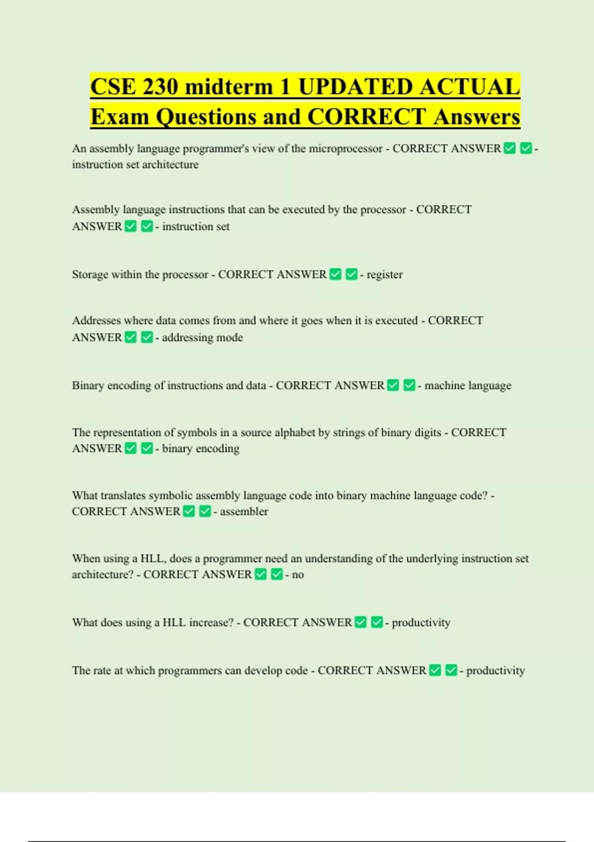 CSE 230 midterm 1 UPDATED ACTUAL Exam Questions and CORRECT Answers An assembly language programmer's view of the microprocessor - CORRECT ANSWER instruction set architecture Assembly language instructions that can be executed by the processor - CORRECT ANSWER - instruction set Storage within the processor - CORRECT ANSWER - registe