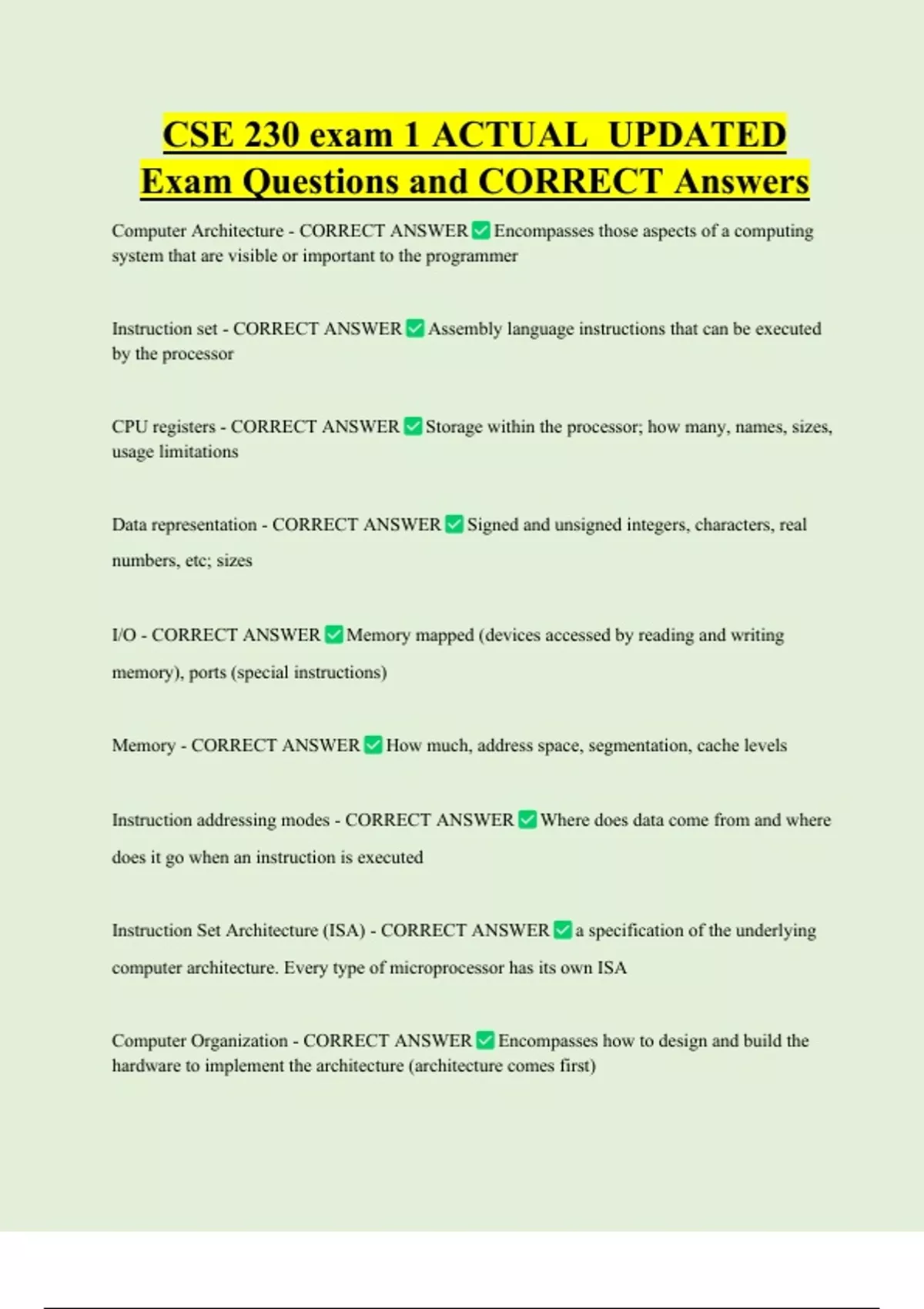 CSE 230 exam 1 ACTUAL UPDATED Exam Questions and CORRECT Answers Computer Architecture - CORRECT ANSWER Encompasses those aspects of a computing system that are visible or important to the programmer Instruction set - CORRECT ANSWER Assembly language instructions that can be executed by the processor CPU registers - CORRECT ANSWER Storage within the processor; how many, names, sizes,
