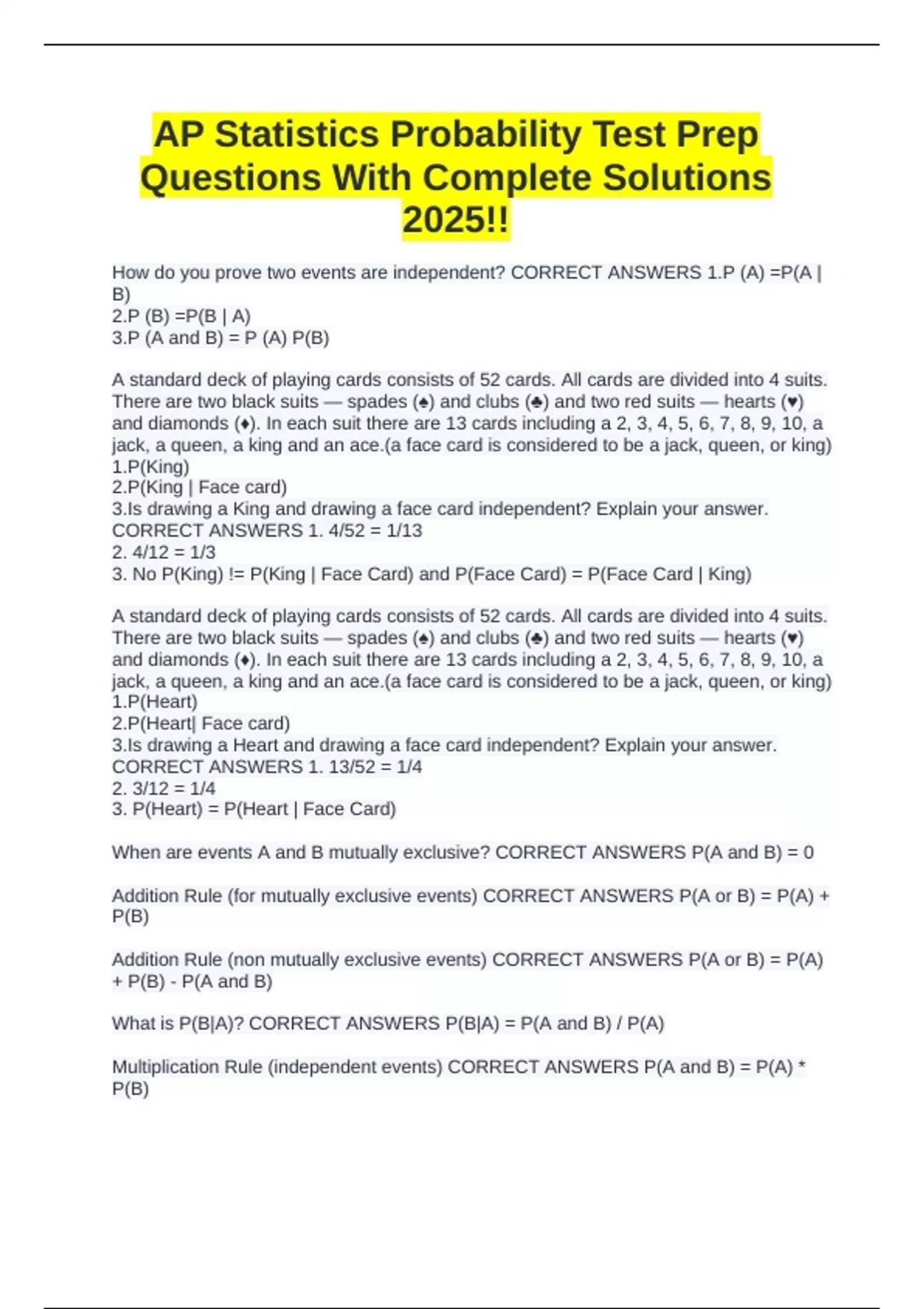 CORRECT ANSWERS 1. 13/52 = 1/4