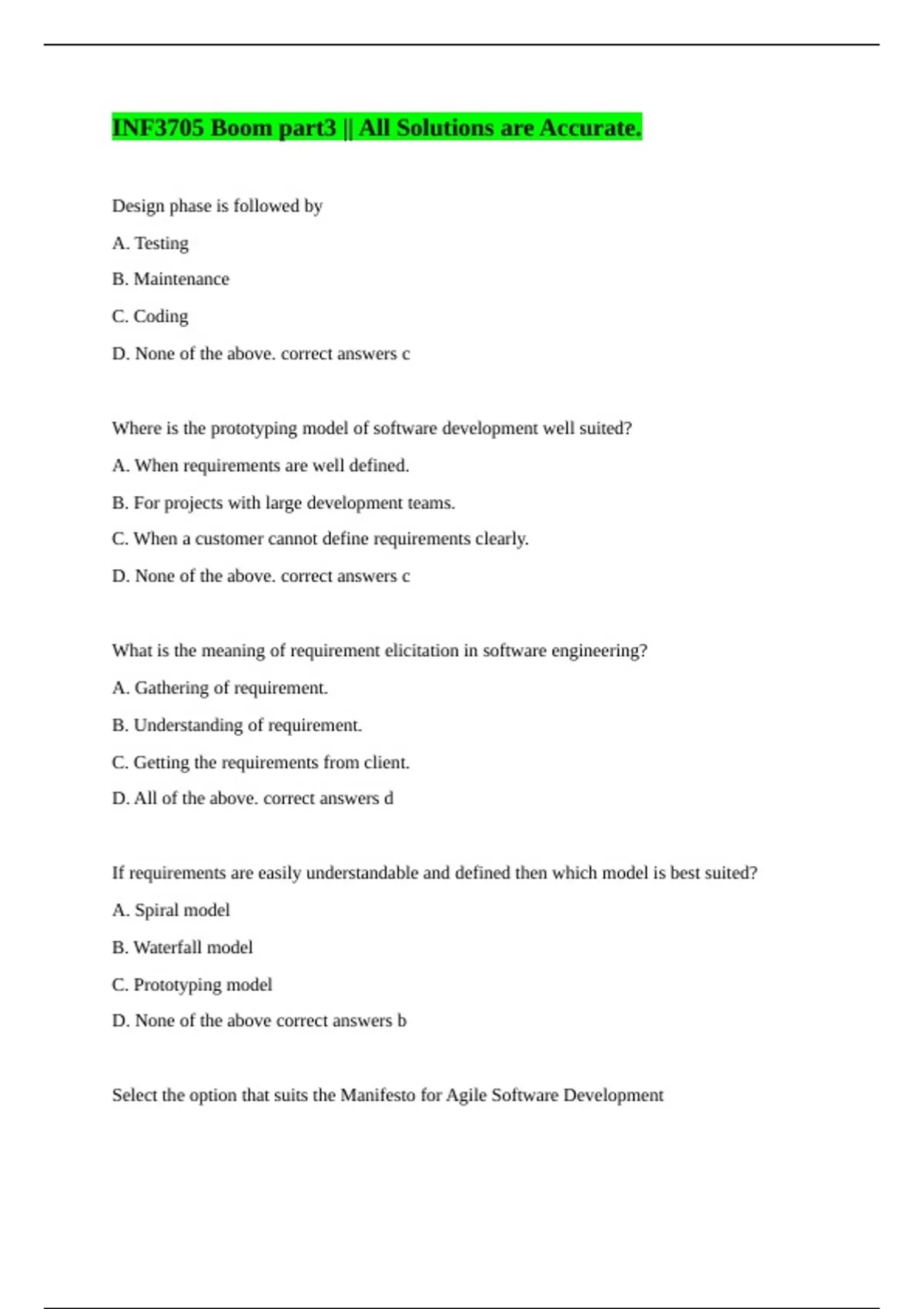 Design phase is followed by A. Testing B. Maintenance C. Coding D. None of the above. correct answers c Where is the prototyping model of software development well suited? A. When requirements are well defined. B. For projects with large development teams. C. When a customer cannot define requirements clearly. D. None of the above. correct answers c What is the meaning of requirement elicitation in software engineering? A. Gathering of requirement. B. Understanding of requirement. C. Getting the requirements from client. D. All of the above. correct answers d If requirements are easily understandable and defined then which model is best suited? A. Spiral model B. Waterfall model C. Prototyping model D. None of the above correct answers b Select the option that suits the Manifesto for Agile Software Development