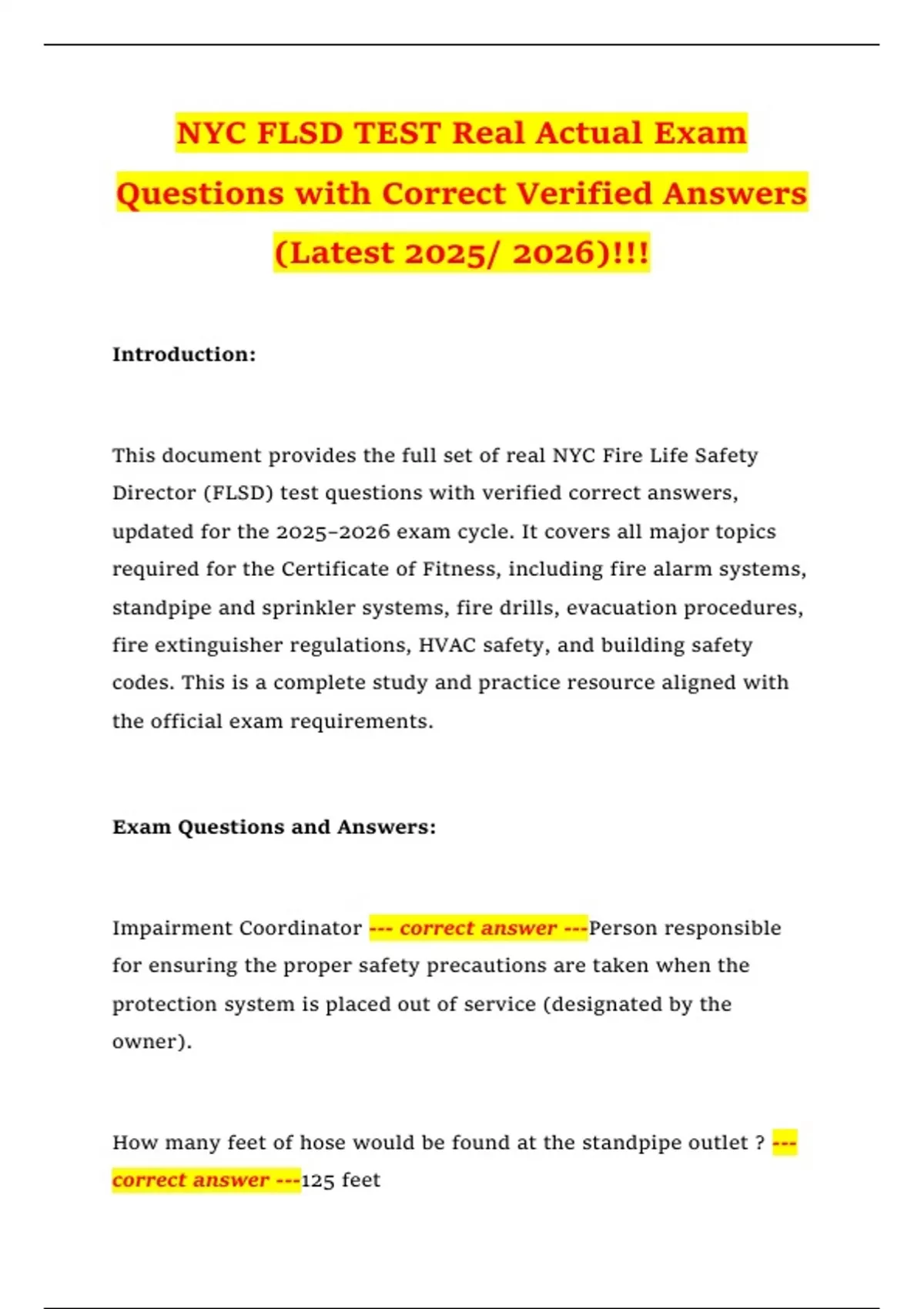 NYC FLSD TEST Real Actual Exam Questions with Correct Verified Answers (Latest 2025/ 2026)!!! Introduction: This document provides the full set of real NYC Fire Life Safety Director (FLSD) test questions with verified correct answers, updated for the 2025–2026 exam cycle. It covers all major topics required for the Certificate of Fitness, including fire alarm systems, standpipe and sprinkler systems, fire drills, evacuation procedures, fire extinguisher regulations, HVAC safety, and building safety codes. This is a complete study and practice resource aligned with the official exam requirements. Exam Questions and Answers: Impairment Coordinator --- correct answer ---Person responsible for ensuring the proper safety precautions are taken when the protection system is placed out of service (designated by the owner). How many feet of hose would be found at the standpipe outlet ? --- correct answer ---125 feet In fire prevention there are three areas to consider: --- correct answer ---Education (building tenants) Engineering (layout, suppression systems etc) Enforcement(Building codes, Fire codes)