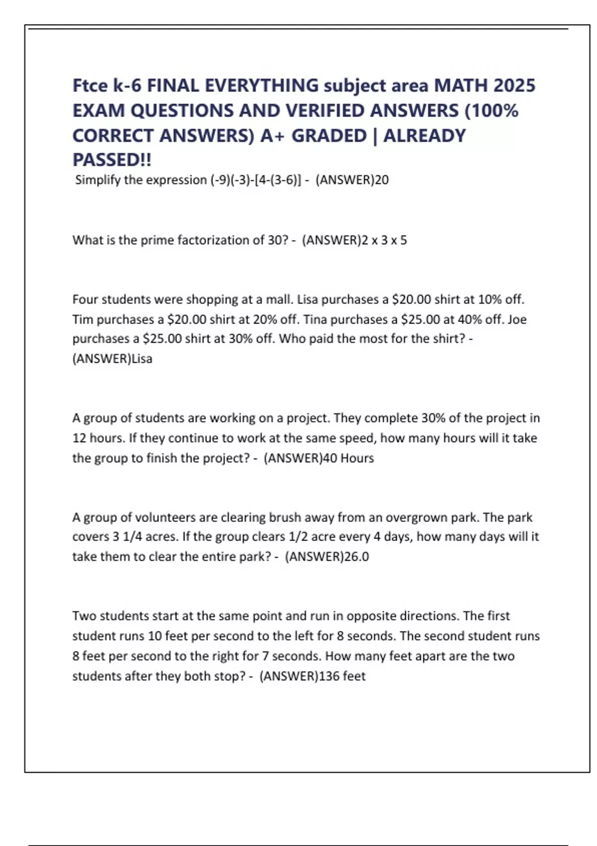 Ftce k-6 FINAL EVERYTHING subject area MATH 2025 EXAM QUESTIONS AND VERIFIED ANSWERS (100% CORRECT ANSWERS) A+ GRADED | ALREADY PASSED!!
