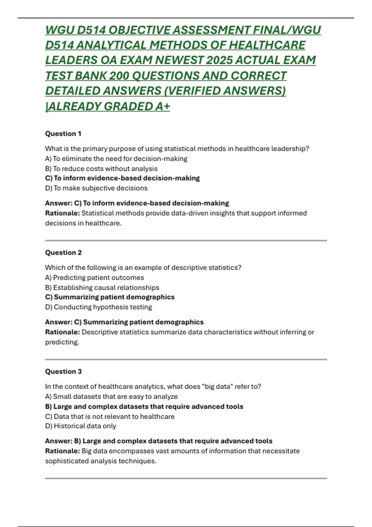 This WGU D514 Analytical Methods of Healthcare Leaders OA exam prep resource provides over 200 verified questions with complete answers and detailed rationales, covering essential topics such as data-driven decision making, healthcare leadership strategies, performance measurement, quality improvement, healthcare analytics, and organizational effectiveness. Updated for 2025/2026, this comprehensive study guide is designed for Western Governors University students preparing for the D514 OA exam, offering reliable practice, improved understanding, and the confidence needed to excel in healthcare leadership and management.