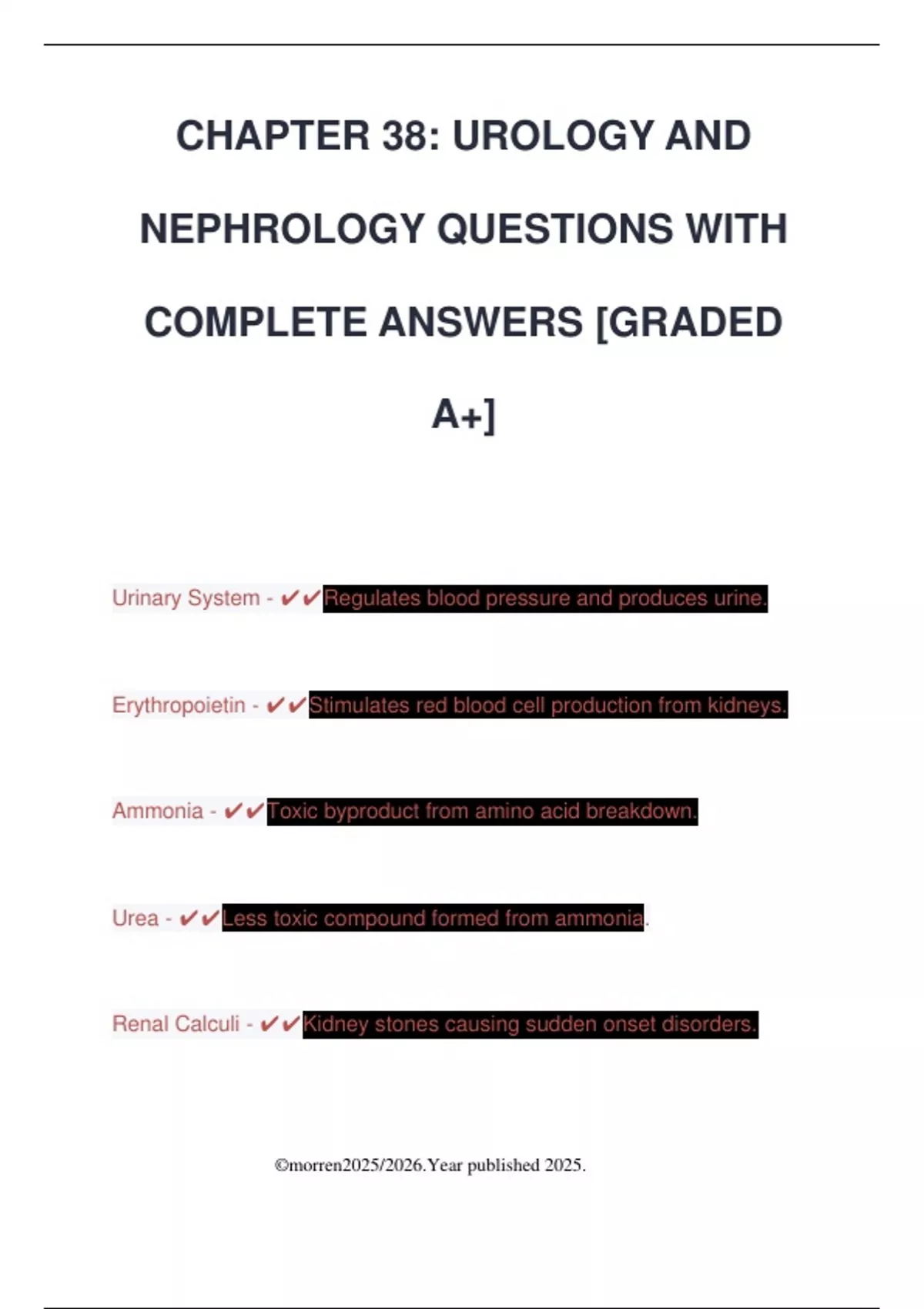 CHAPTER 38: UROLOGY AND NEPHROLOGY QUESTIONS WITH COMPLETE ANSWERS [GRADED A+] Urinary System - Regulates blood pressure and produces urine. Erythropoietin - Stimulates red blood cell production from kidneys. Ammonia - Toxic byproduct from amino acid breakdown. Urea - Less toxic compound formed from ammonia. Renal Calculi - Kidney stones causing sudden onset disorders. ©morren2025/2026.Year published 2025.