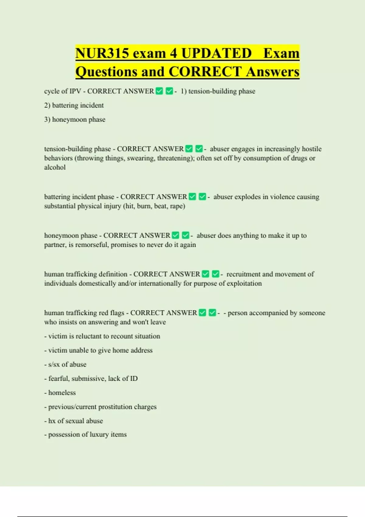 NUR315 exam 4 UPDATED Exam Questions and CORRECT Answers cycle of IPV - CORRECT ANSWER 2) battering incident 3) honeymoon phase - 1) tension-building phase tension-building phase - CORRECT ANSWER - abuser engages in increasingly hostile behaviors (throwing things, swearing, threatening); often set off by consumption of drugs or alcoho