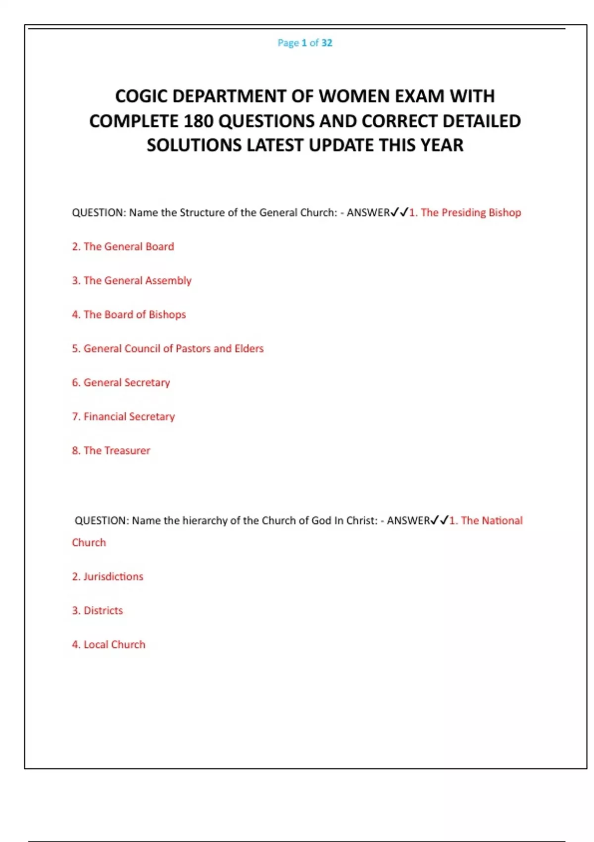 QUESTION: Name the hierarchy of the Church of God In Christ: - ANSWER✔✔1. The National
