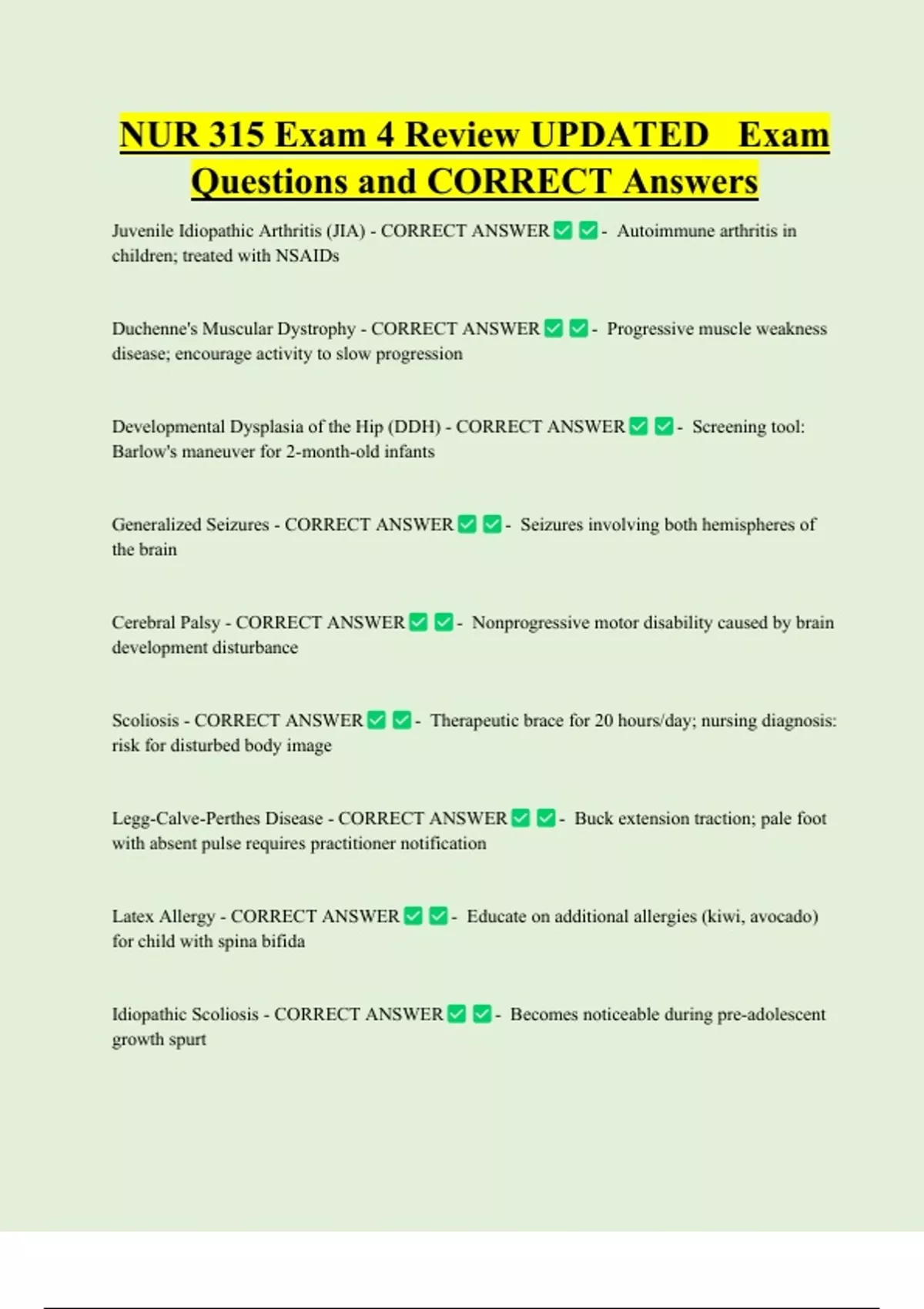 NUR 315 Exam 4 Review UPDATED Exam Questions and CORRECT Answers Juvenile Idiopathic Arthritis (JIA) - CORRECT ANSWER children; treated with NSAIDs Duchenne's Muscular Dystrophy - CORRECT ANSWER disease; encourage activity to slow progression - Autoimmune arthritis in - Progressive muscle weakness Developmental Dysplasia of the Hip (DDH) - CORRECT ANSWER Barlow's maneuver for 2-month-old infants Generalized Seizures - CORRECT ANSWER - Screening too