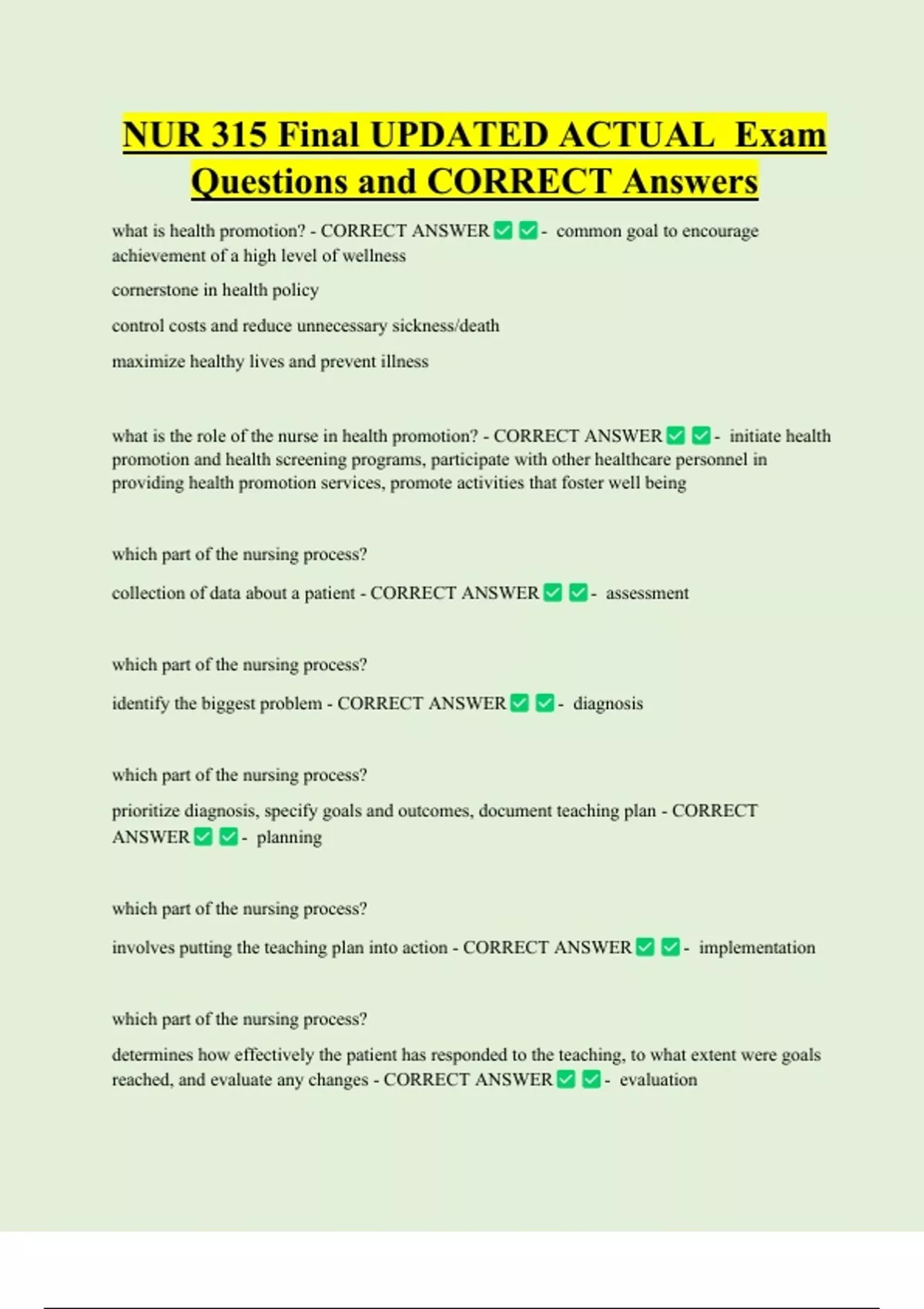 NUR 315 Final UPDATED ACTUAL Exam Questions and CORRECT Answers what is health promotion? - CORRECT ANSWER achievement of a high level of wellness cornerstone in health policy control costs and reduce unnecessary sickness/death maximize healthy lives and prevent illness - common goal to encourage what is the role of the nurse in health promotion? - CORRECT ANSWER - initiate health promotion and health screening programs, participate with other healthcare personnel in providing health promotion services, promote activities that foster well being