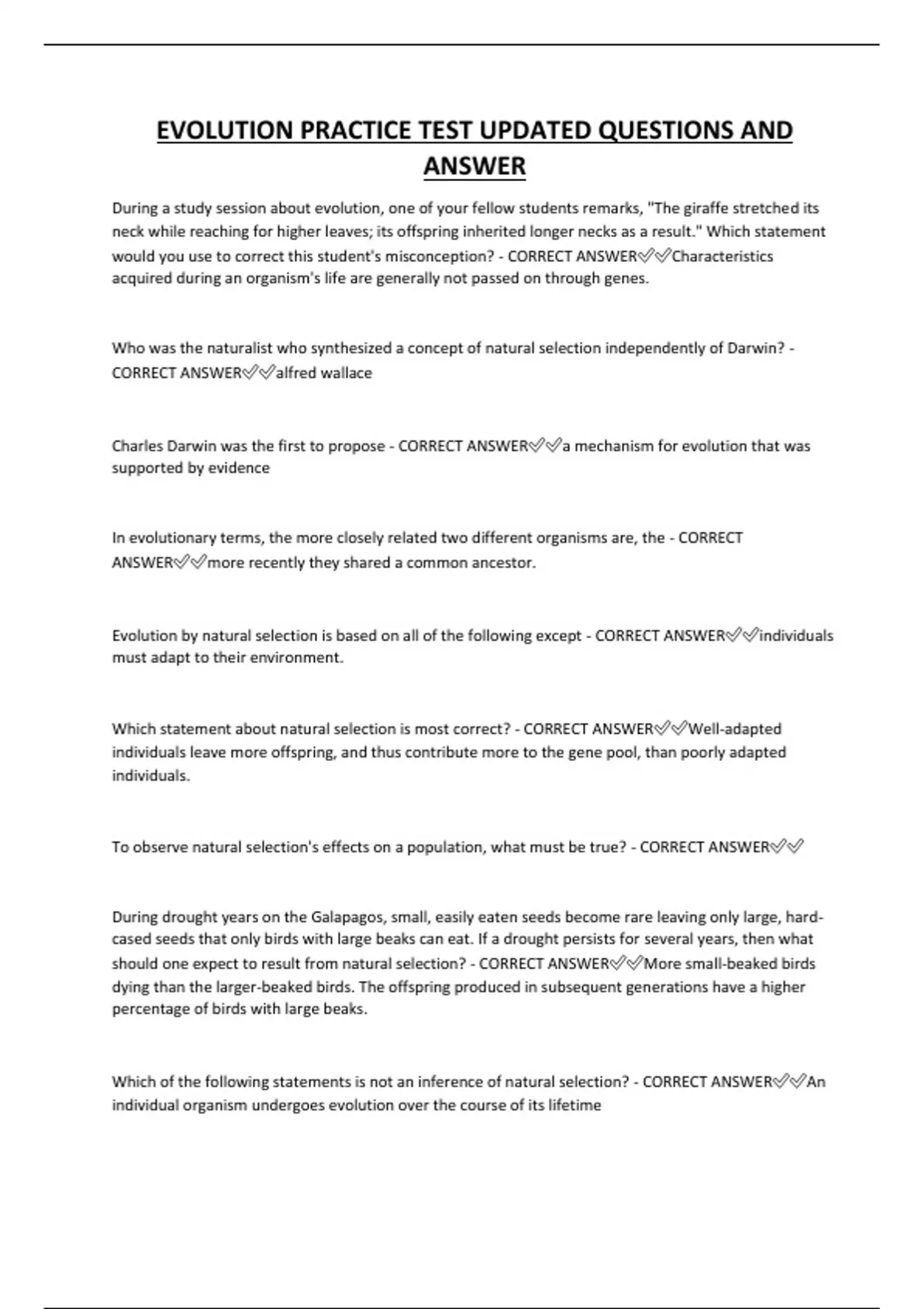 EVOLUTION PRACTICE TEST UPDATED QUESTIONS AND ANSWER During a study session about evolution, one of your fellow students remarks, "The giraffe stretched its neck while reaching for higher leaves; its offspring inherited longer necks as a result." Which statement would you use to correct this student's misconception? - CORRECT ANSWERCharacteristics acquired during an organism's life are generally not passed on through genes.