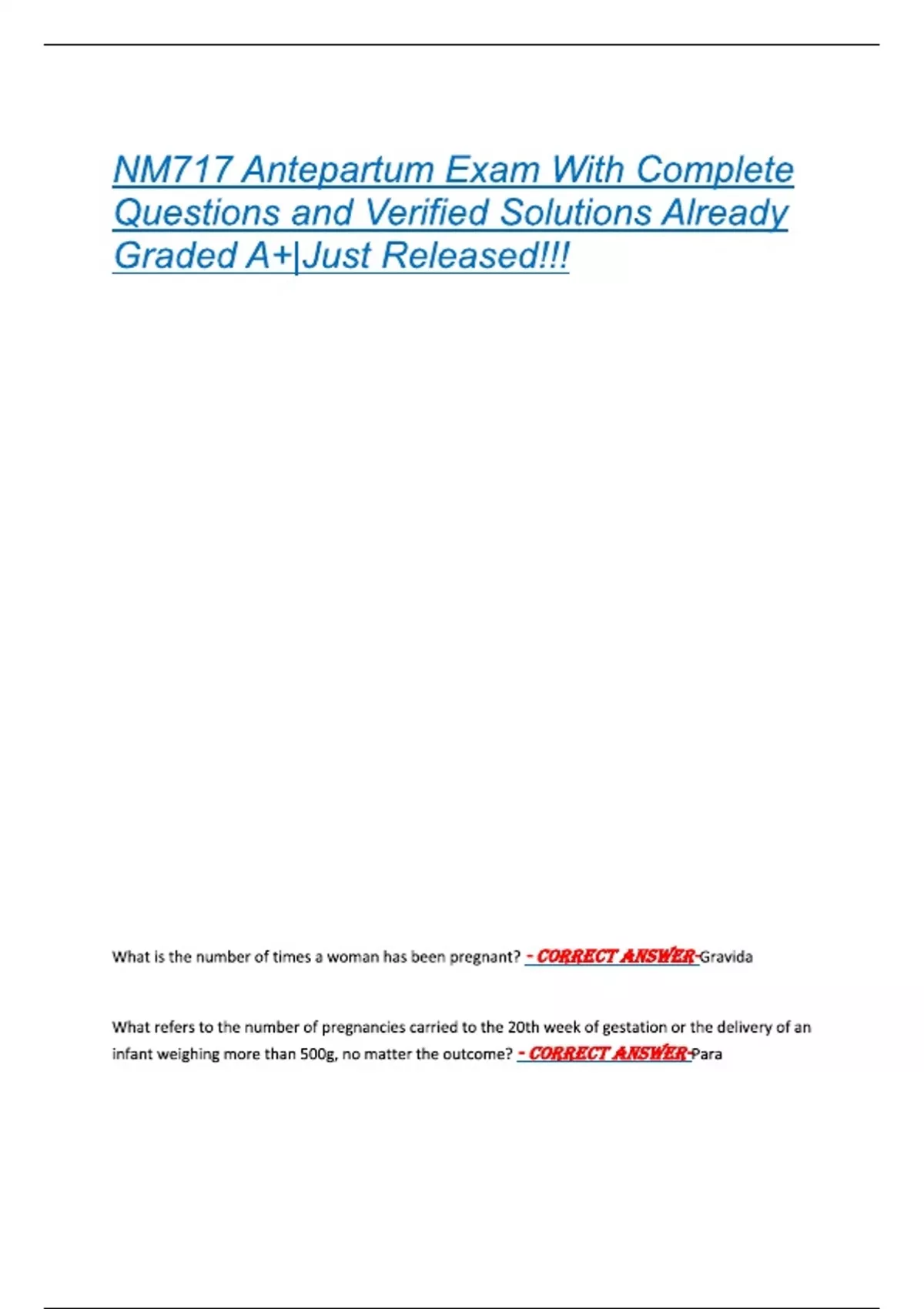 NM717 Antepartum Exam With Complete Questions and Verified Solutions Already Graded A+|Just Released!!!NM717 Antepartum Exam With Complete Questions and Verified Solutions Already Graded A+|Just Released!!!
