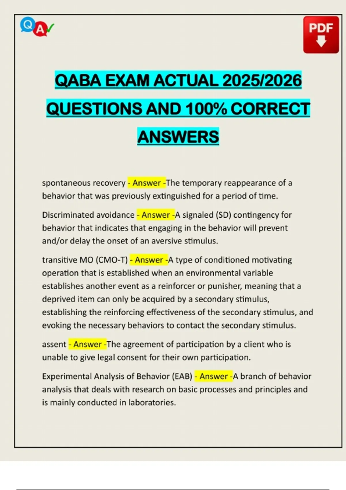 QABA EXAM ACTUAL 2025/2026 QUESTIONS AND 100% CORRECT ANSWERS spontaneous recovery - Answer -The temporary reappearance of a behavior that was previously extinguished for a period of time. Discriminated avoidance - Answer -A signaled (SD) contingency for behavior that indicates that engaging in the behavior will prevent and/or delay the onset of an aversive stimulus. transitive MO (CMO-T) - Answer -A type of conditioned motivating operation that is established when an environmental variable establishes another event as a reinforcer or punisher, meaning that a deprived item can only be acquired by a secondary stimulus, establishing the reinforcing effectiveness of the secondary stimulus, and evoking the necessary behaviors to contact the secondary stimulus. assent - Answer -The agreement of participation by a client who is unable to give legal consent for their own participation. Experimental Analysis of Behavior (EAB) - A