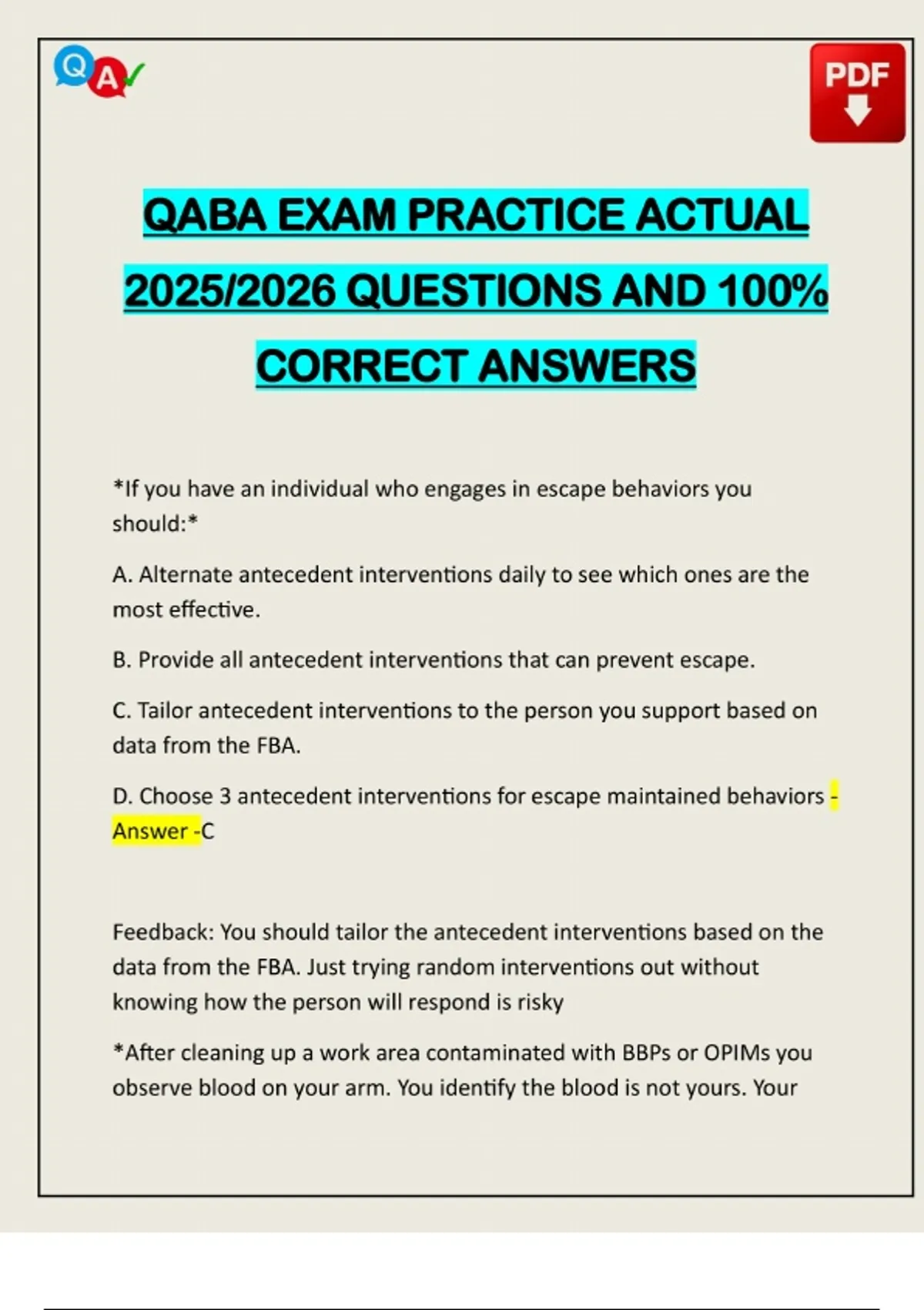 QABA EXAM PRACTICE ACTUAL 2025/2026 QUESTIONS AND 100% CORRECT ANSWERS *If you have an individual who engages in escape behaviors you should:* A. Alternate antecedent interventions daily to see which ones are the most effective. B. Provide all antecedent interventions that can prevent escape. C. Tailor antecedent interventions to the person you support based on data from the FBA. D. Choose 3 antecedent interventions for escape maintained behaviors - Answer -C Feedback: You should tailor the antecedent interventions based on the data from the FBA. Just trying random interventions out without knowing how the person will respond is risky *After cleaning up a work area contaminated with BBPs or OPIMs you observe blood on your arm. You identify the bloo
