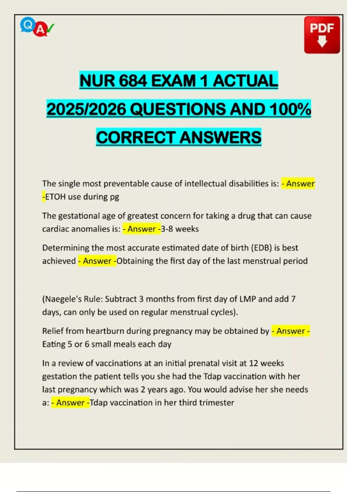 NUR 684 EXAM 1 ACTUAL 2025/2026 QUESTIONS AND 100% CORRECT ANSWERS The single most preventable cause of intellectual disabilities is: - Answer -ETOH use during pg The gestational age of greatest concern for taking a drug that can cause cardiac anomalies is: - Answer -3-8 weeks Determining the most accurate estimated date of birth (EDB) is best achieved - Answer -Obtaining the first day of the last menstrual period (Naegele's Rule: Subtract 3 mont