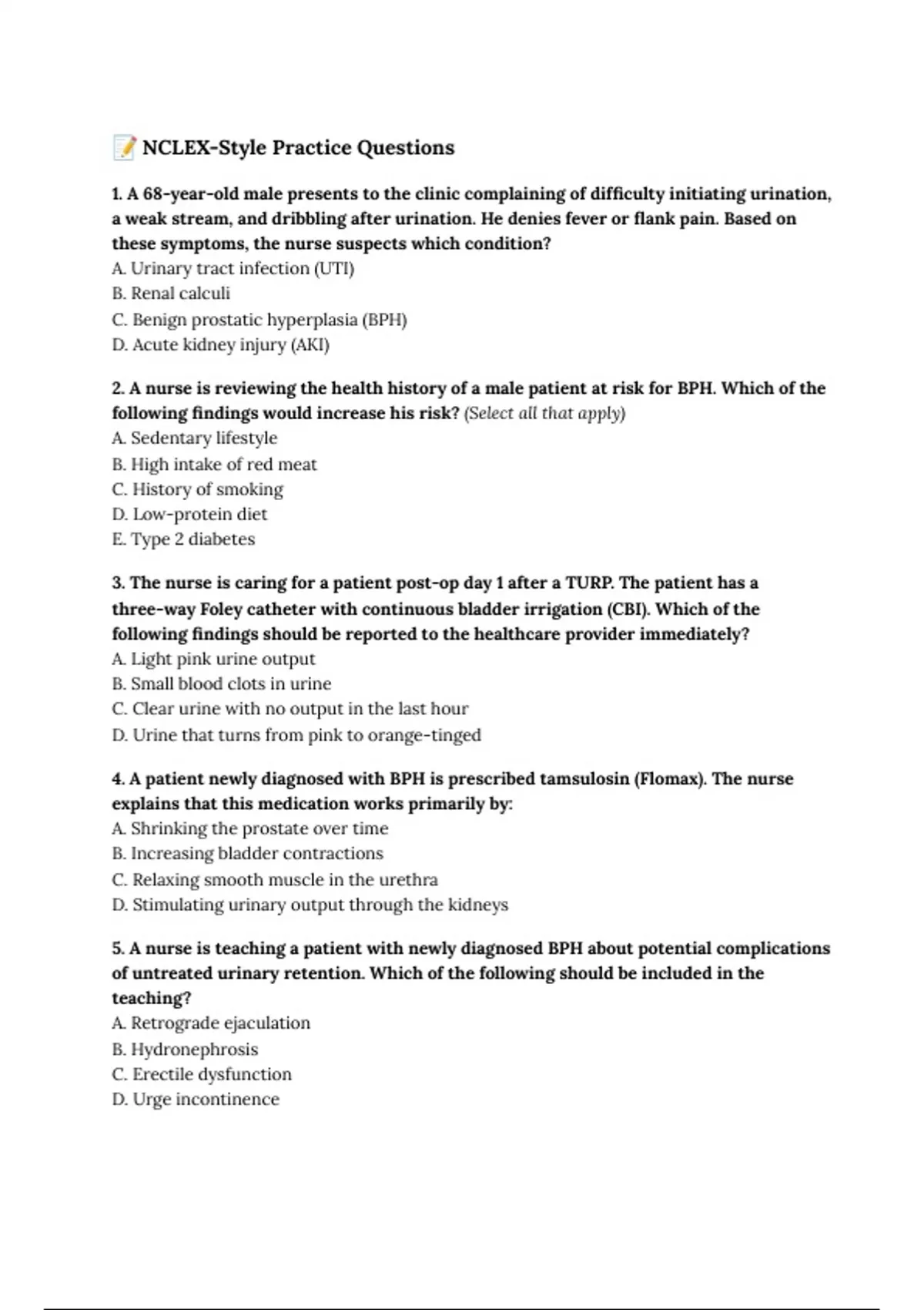 5. A nurse is teaching a patient with newly diagnosed BPH about potential complications